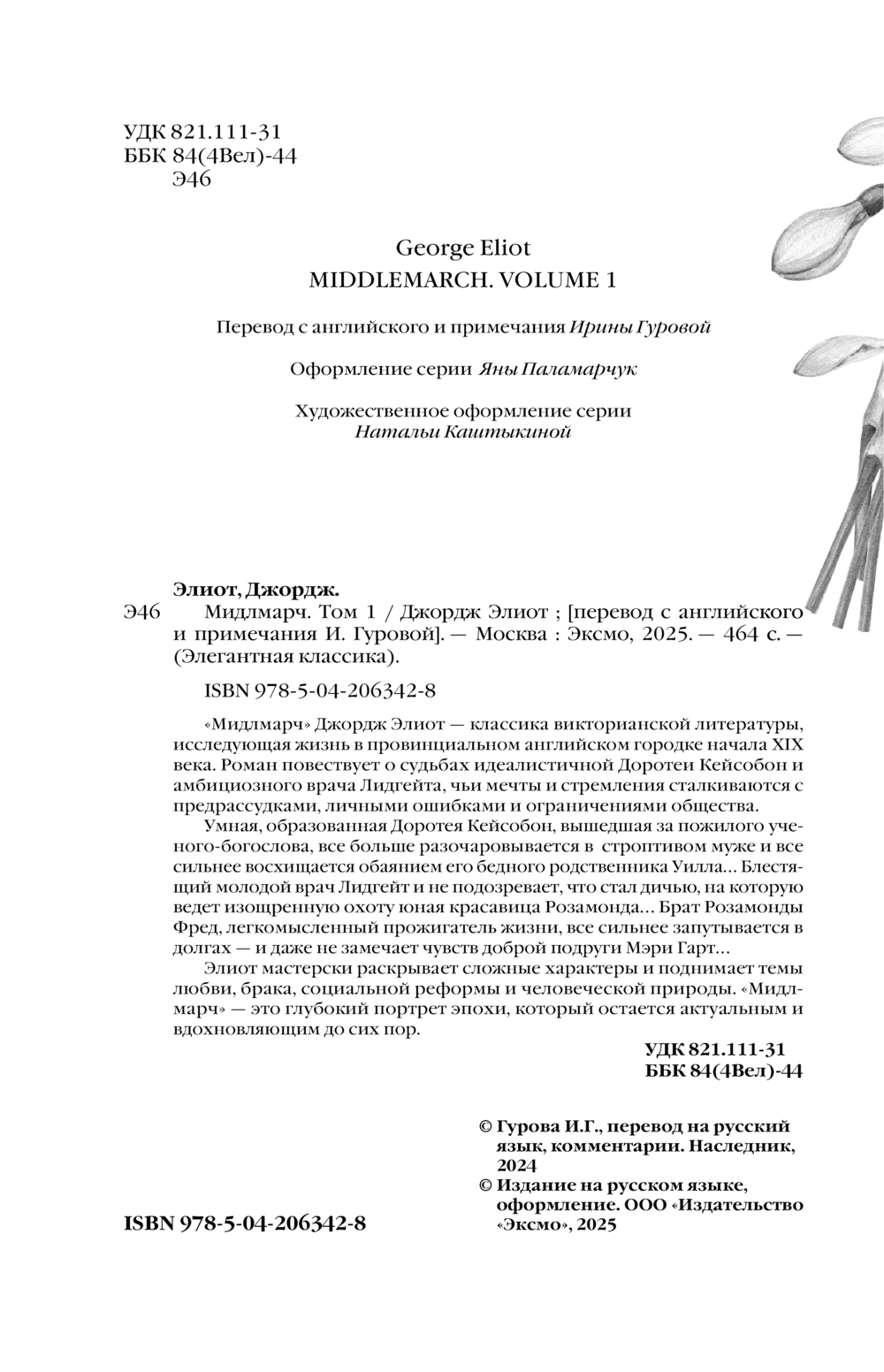 "Мидлмарч" Джордж Элиот – классика викторианской литературы, исследующая жизнь в провинциальном английском городке начала XIX века. Роман повествует о судьбах идеалистичной Доротеи Кейсобон и амбициозного врача Лидгейта, чьи мечты и стремления сталкиваются с предрассудками, личными ошибками и ограничениями общества.