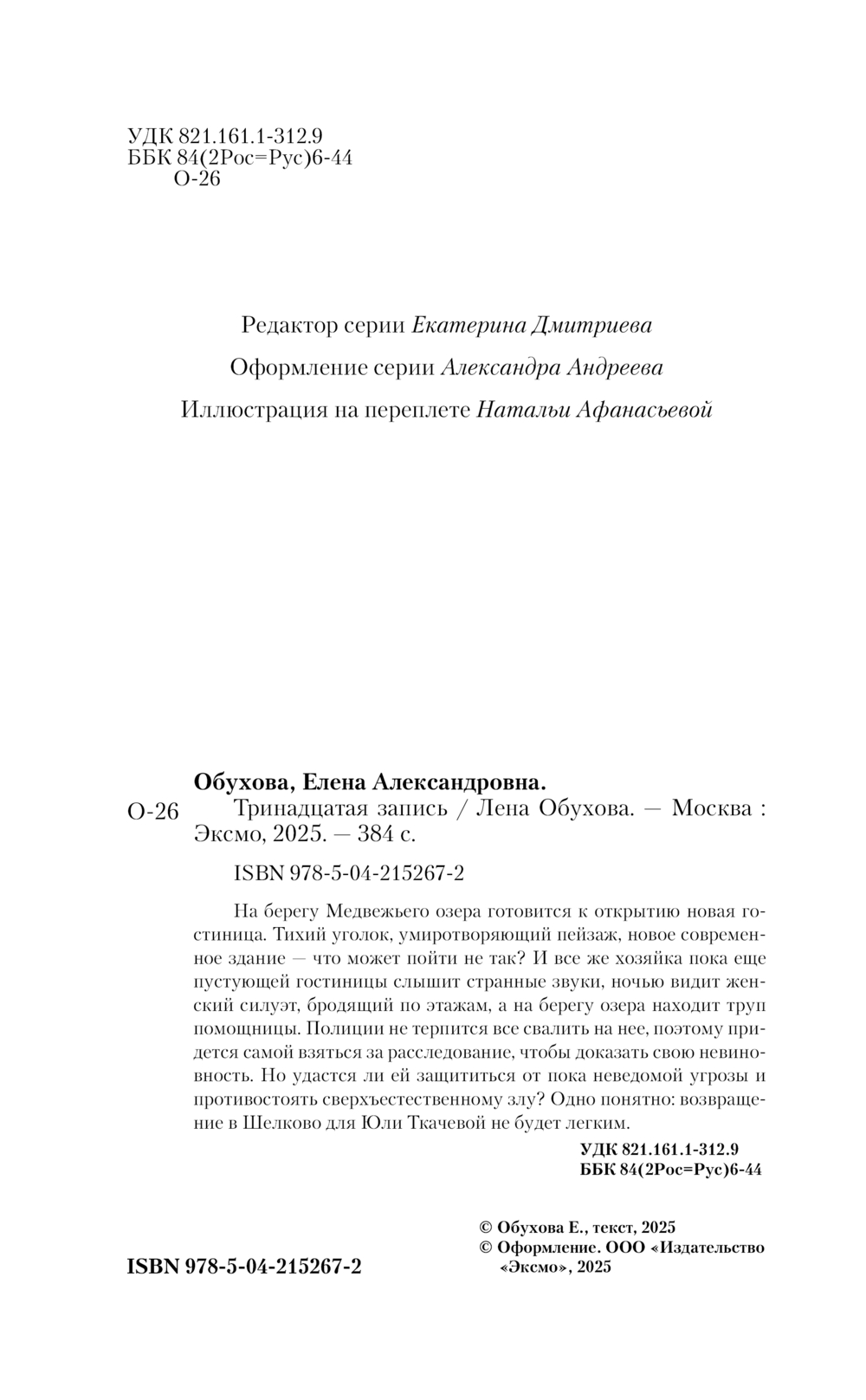 На берегу Медвежьего озера готовится к открытию новая гостиница. Тихий уголок, умиротворяющий пейзаж, новое современное здание – что может пойти не так? И все же хозяйка пока еще пустующей гостиницы слышит странные звуки, ночью видит женский силуэт, бродящий по этажам, а на берегу озера находит труп помощницы. Полиции не терпится все свалить на нее, поэтому придется самой взяться за расследование, чтобы доказать свою невиновность. Но удастся ли ей защититься от пока неведомой угрозы и противостоять сверхъестественному злу? Одно понятно: возвращение в Шелково для Юли Ткачевой не будет легким.