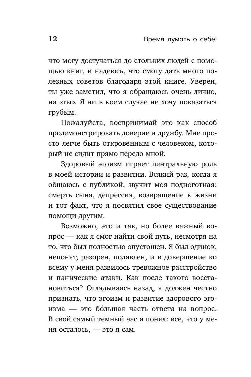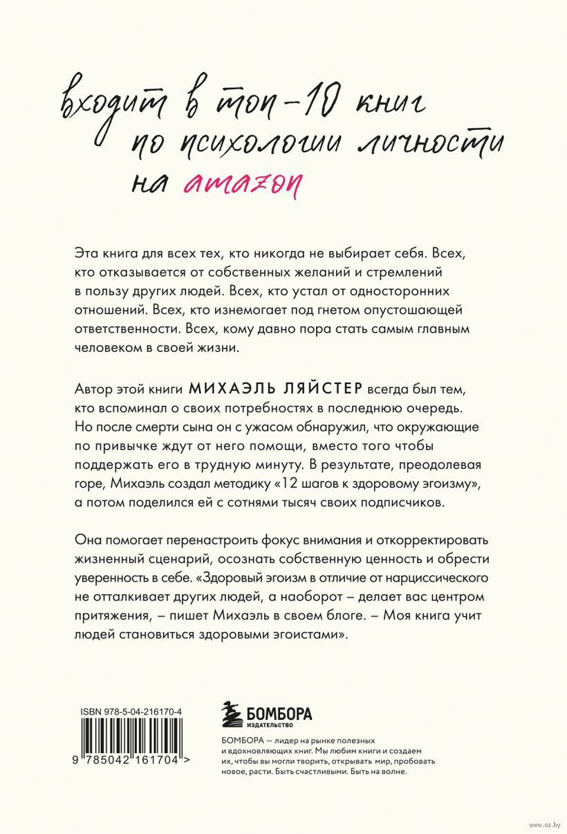 Автор этой книги Михаэль Ляйстер всегда был тем, кто вспоминал о своих потребностях в последнюю очередь. Но после смерти сына он с ужасом обнаружил, что окружающие по привычке ждут от него помощи, вместо того, чтобы поддержать его в трудную минуту. В результате, преодолевая горе, Михаэль создал методику "12 шагов к здоровому эгоизму", а потом поделился ей с сотнями тысяч своих подписчиков. Она помогает перенастроить фокус внимания и откорректировать жизненный сценарий, осознать собственную ценность и обрести уверенность в себе.