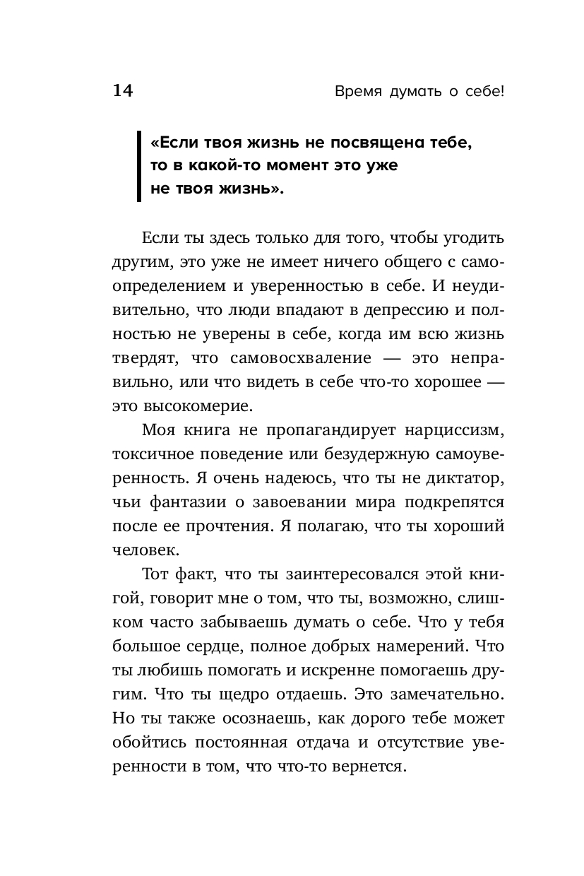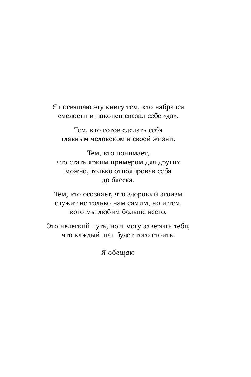 Эта книга для всех тех, кто никогда не выбирает себя. Всех, кто отказывается от собственных желаний и стремлений в пользу других людей. Всех, кто устал от односторонних отношений. Всех, кто изнемогает под гнетом опустошающей ответственности. Всех, кому давно пора стать самым главным человеком в своей жизни.
