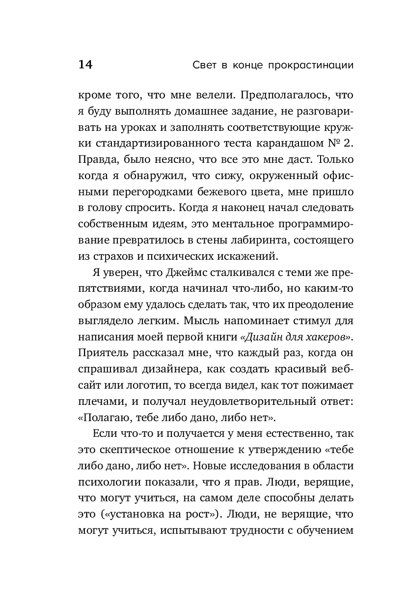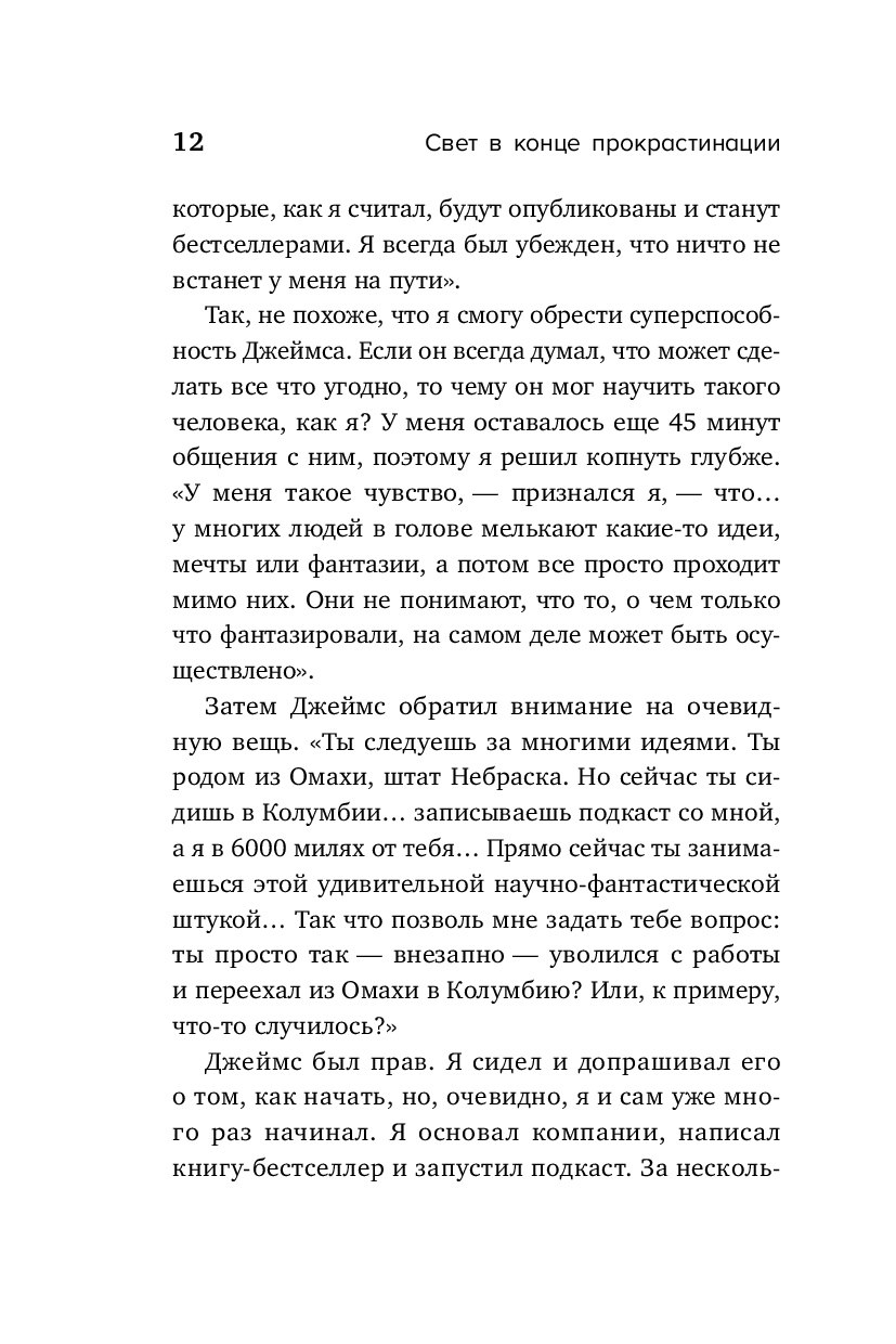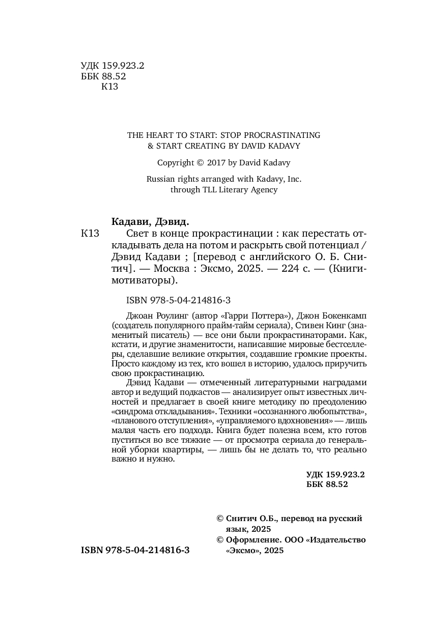 Дэвид Кадави – отмеченный литературными наградами автор и ведущий подкастов – анализирует опыт известных личностей и предлагает в своей книги методику по преодолению "синдрома откладывания". Техники "осознанного любопытства", "планового отступления", "управляемого вдохновения" – лишь малая часть его подхода. Книга будет полезна всем, кто готов пуститься во все тяжкие – от просмотра сериала до генеральной уборки квартиры – лишь бы не делать то, что реально важно и нужно.