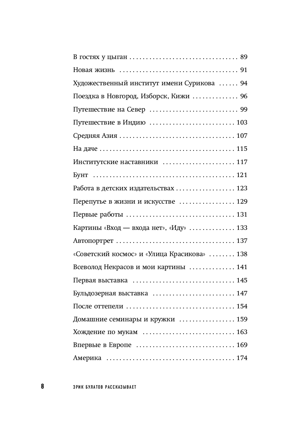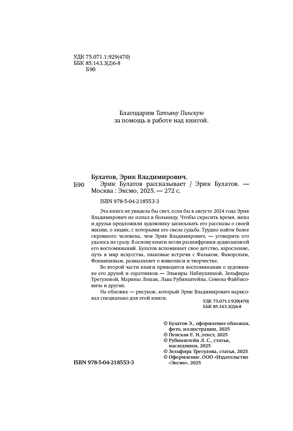 Эта книга не увидела бы свет, если бы в августе 2024 года Эрик Владимирович не попал в больницу. Чтобы скрасить время, жена и друзья предложили художнику записывать его рассказы о своей жизни, о людях, с которыми его свела судьба. Трудно найти более скромного человека, чем Эрик Владимирович – уговорить его удалось не сразу. В основу книги легли расшифровки аудиозаписей его воспоминаний. Булатов вспоминает свое детство, взросление, путь в мир искусства, знаковые встречи с Фальком, Фаворским, Фонвизиным, размышляет о живописи и творчестве.