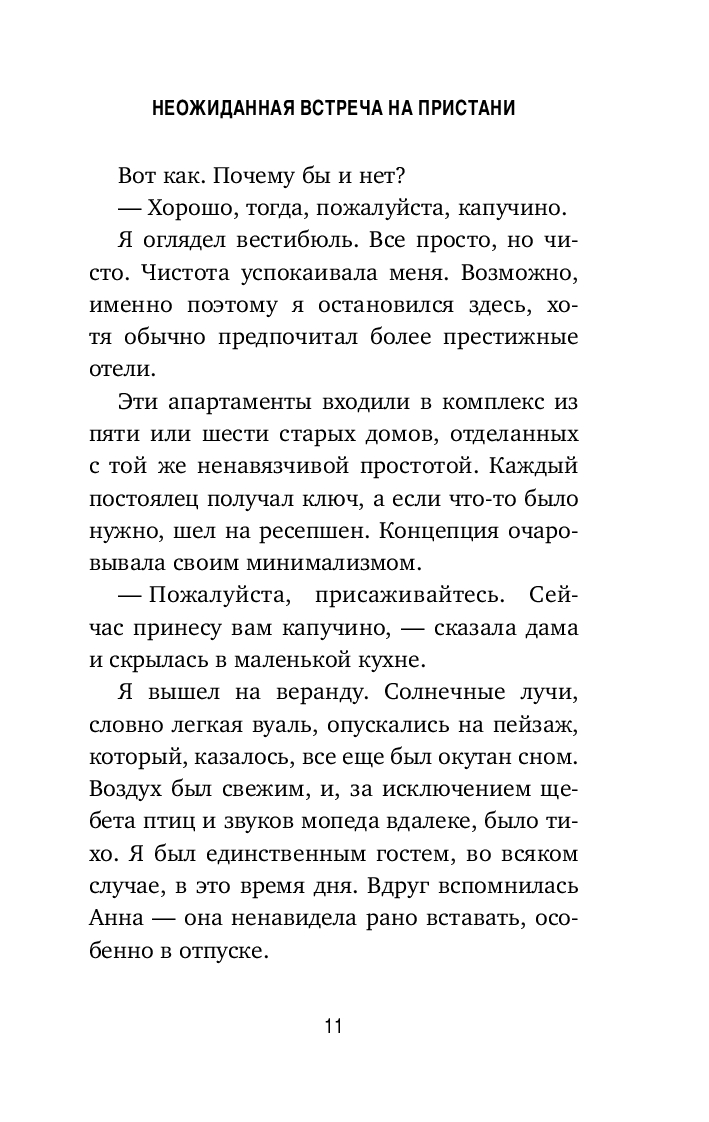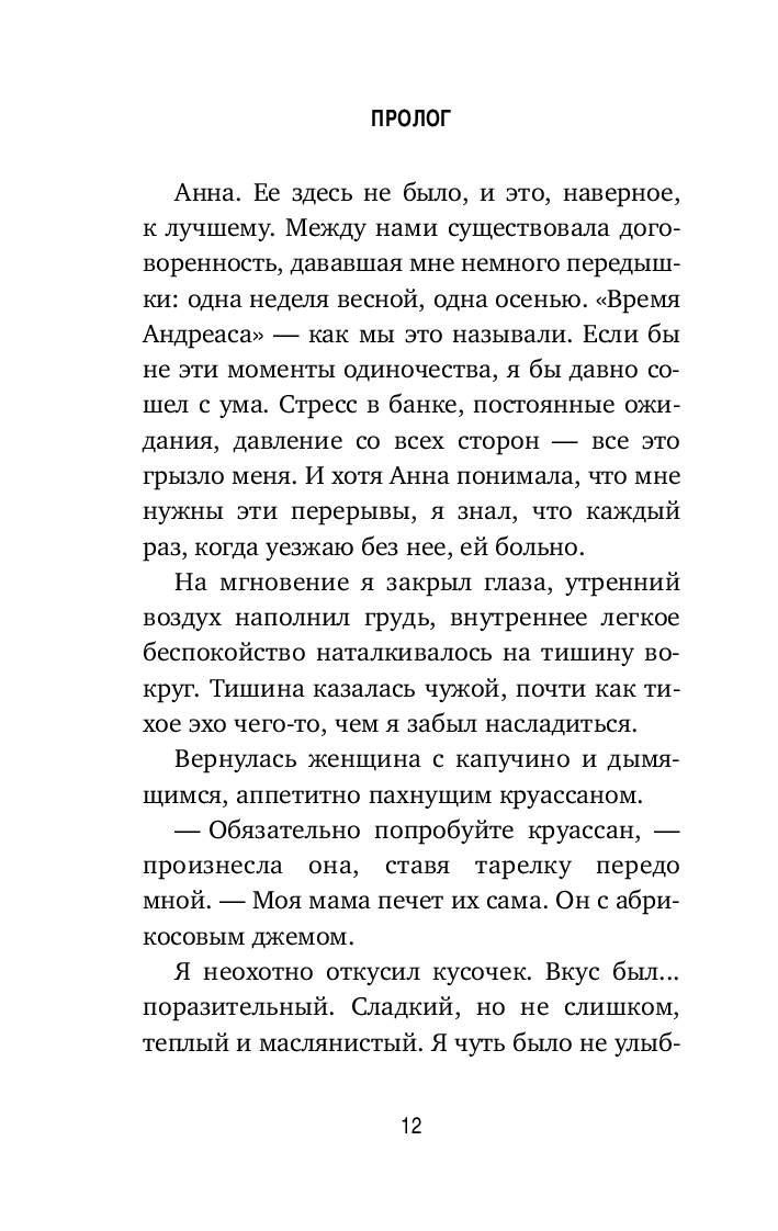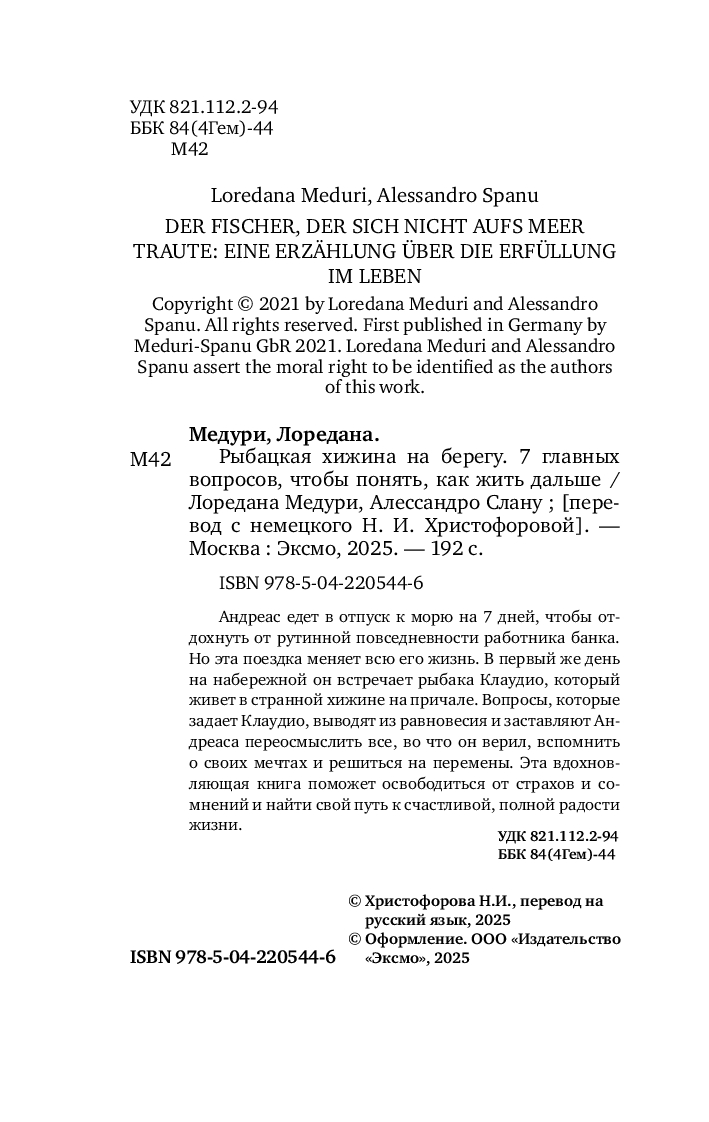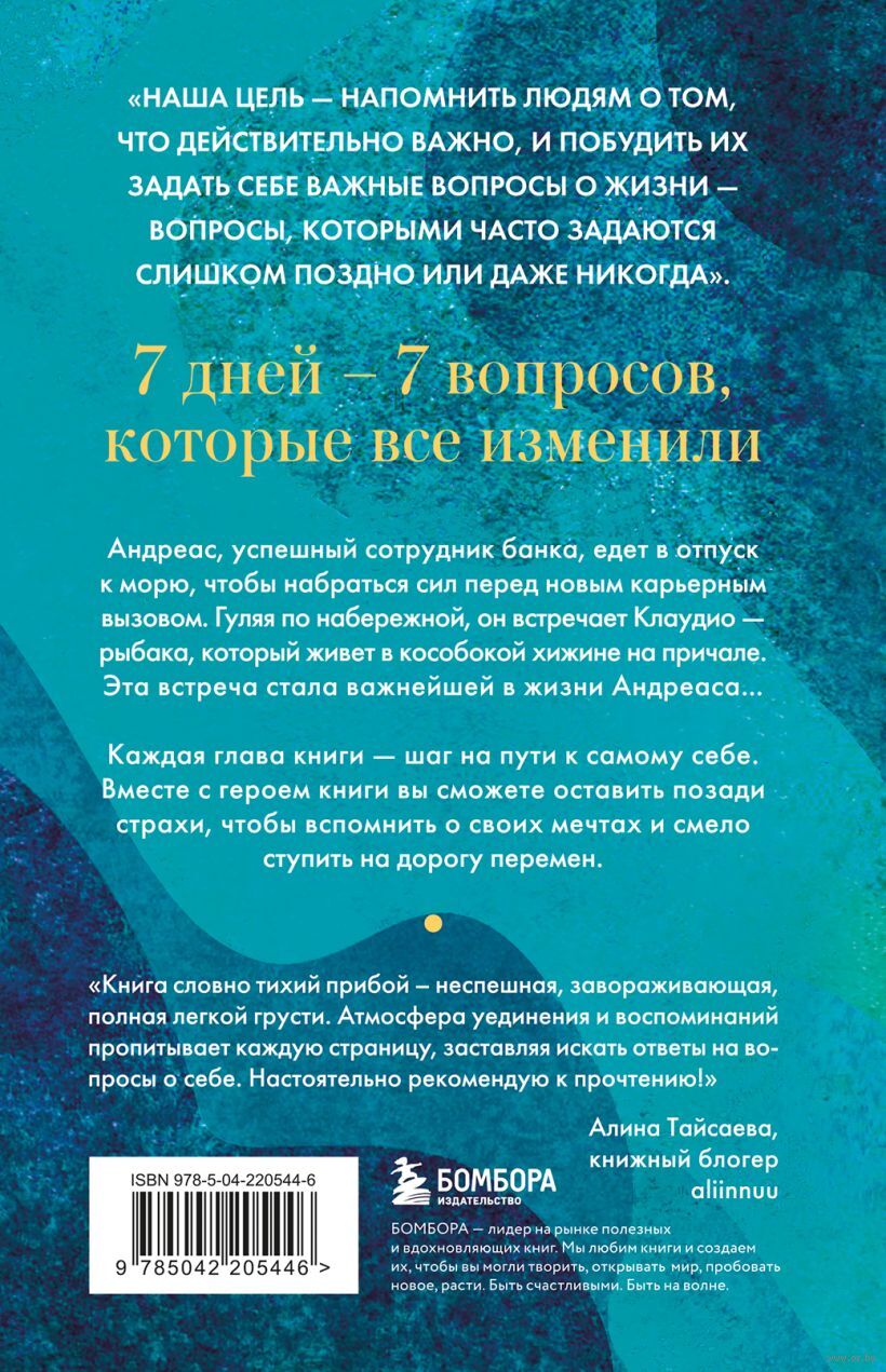 Андреас едет в отпуск к морю на 7 дней, чтобы отдохнуть от рутинной повседневности работника банка. Но эта поездка меняет всю его жизнь. В первый же день на набережной он встречает рыбака Клаудио, который живет в странной хижине на причале. Вопросы, которые задает Клаудио, выводят из равновесия и заставляют Андреаса переосмыслить все, во что он верил, вспомнить о своих мечтах и решиться на перемены. Эта вдохновляющая книга поможет освободиться от страхов и сомнений и найти свой путь к счастливой, полной радости жизни.