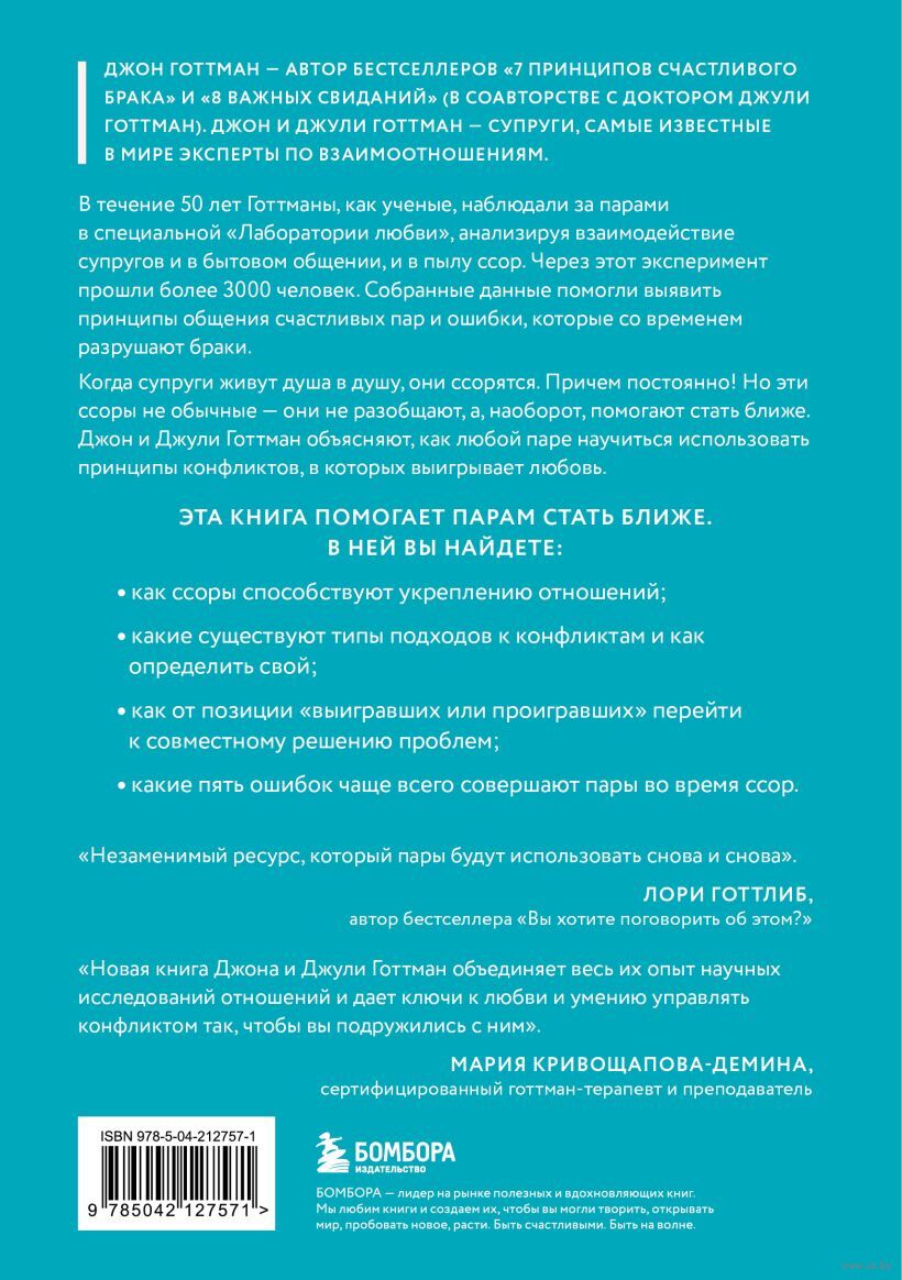 Когда супруги живут душа в душу, они ссорятся. Причем постоянно! Но эти ссоры не обычные – они не разобщают, а, наоборот, помогают стать ближе. Джон и Джули Готтман объясняют, как любой паре научиться использовать принципы конфликтов, в которых выигрывает любовь.