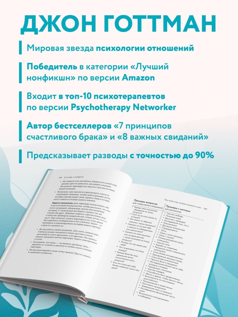 Джон Готтман – автор бестселлеров "7 принципов счастливого брака" и "8 важных свиданий" (в соавторстве с доктором Джули Готтман). Джон и Джули Готтман – супруги, самые известные в мире эксперты по взаимоотношениям.