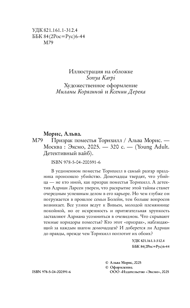 В уединенном поместье Торнхилл в самый разгар праздника произошло убийство. Домочадцы твердят, что убийца – не кто иной, как призрак поместья Торнхилл. А детектив Адриан Ларсен уверен, что раскрытие этой тайны станет очередным успешным делом в его карьере. Но чем глубже он погружается в прошлое семьи Болейн, тем больше вопросов возникает. Все улики ведут к Вивьен, молодой племяннице покойной, но ее искренность и притягательная хрупкость заставляют Адриана усомниться в очевидном. Что скрывают темные коридоры поместья? Кто этот "призрак", наблюдающий за каждым шагом домочадцев? И доберется ли Адриан до правды прежде, чем Торнхилл поглотит их обоих?