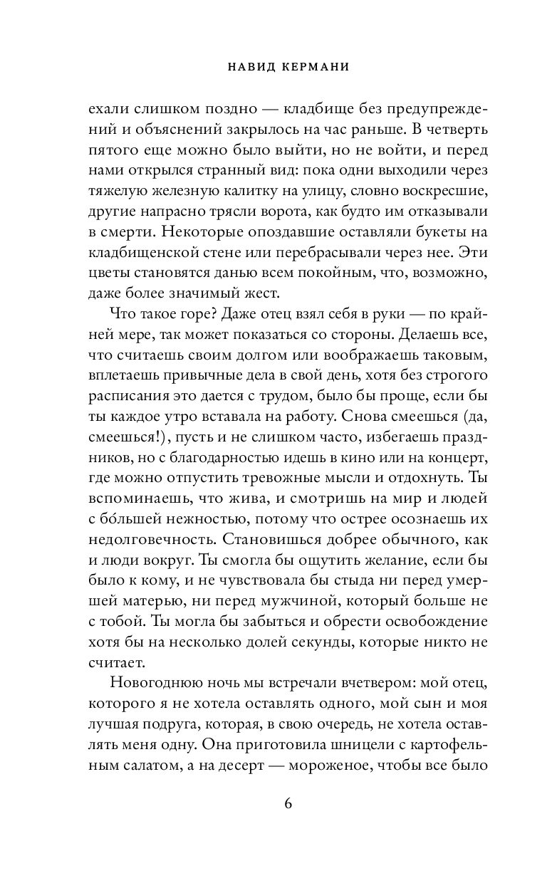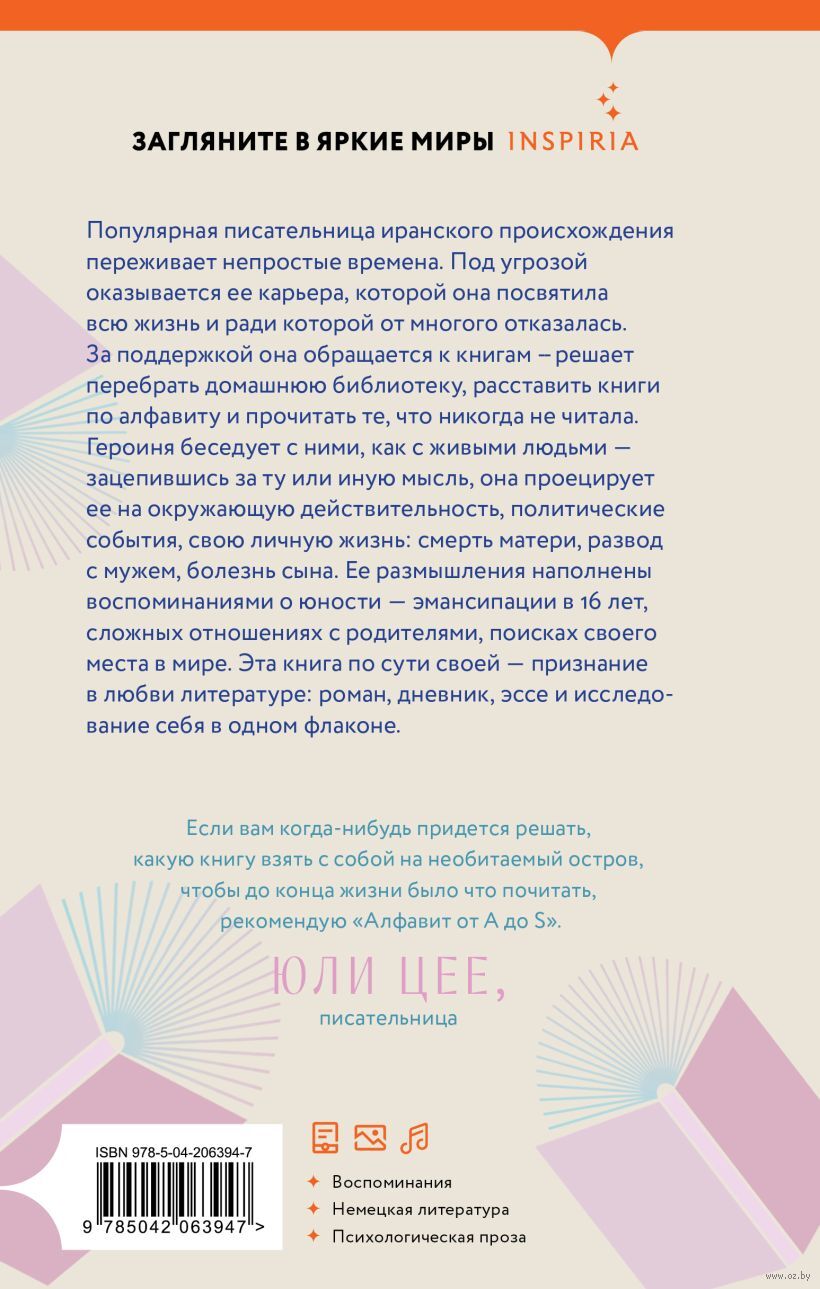 Популярная писательница иранского происхождения переживает непростые времена. Под угрозой оказывается ее карьера, которой она посвятила всю жизнь и ради которой от многого отказалась. За поддержкой она обращается к книгам – решает перебрать домашнюю библиотеку, расставить книги по алфавиту и прочитать те, что никогда не читала. Героиня беседует с ними, как с живыми людьми – зацепившись за ту или иную мысль, она проецирует ее на окружающую действительность, политические события, свою личную жизнь: смерть матери, развод с мужем, болезнь сына. Ее размышления наполнены воспоминаниями о юности – эмансипации в 16 лет, сложных отношениях с родителями, поисках своего места в мире. Эта книга по сути своей – признание в любви литературе: роман, дневник, эссе и исследование себя в одном флаконе.