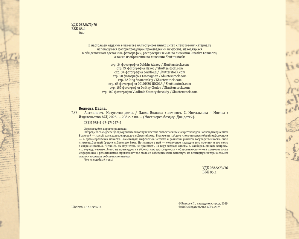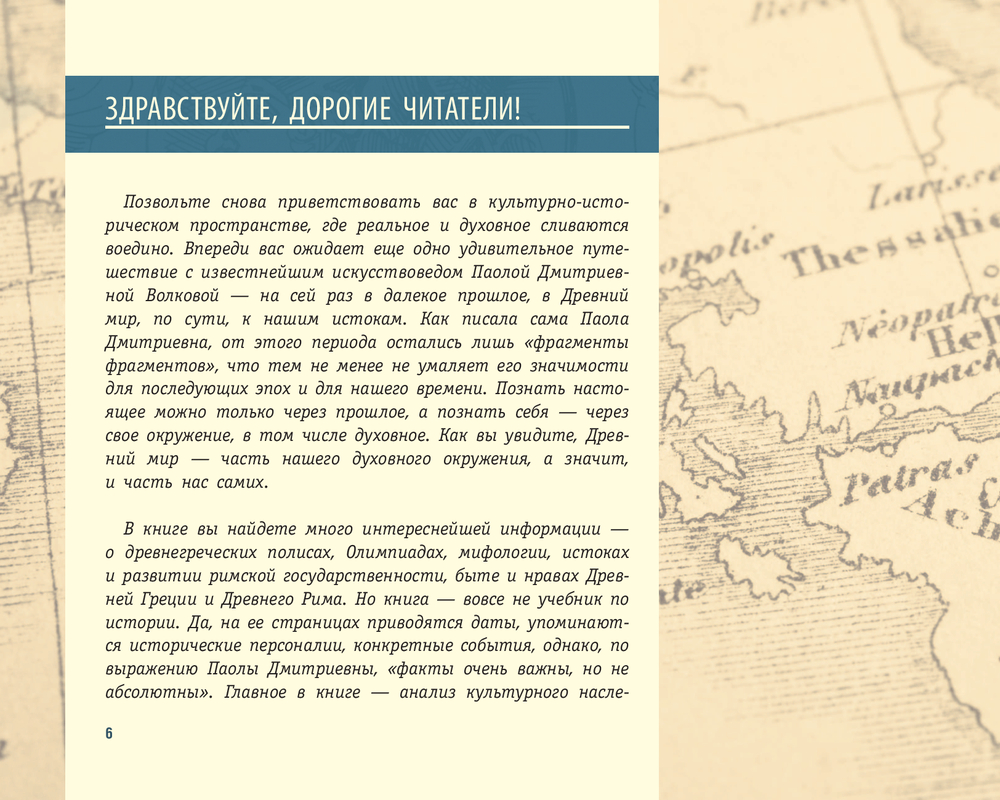 Впереди вас ожидает еще одно удивительное путешествие с известнейшим искусствоведом Паолой Дмитриевной Волковой – на сей раз в далекое прошлое, в Древний мир, к нашим истокам. В книге вы найдете много интереснейшей информации – о древнегреческих полисах, Олимпиадах, мифологии, истоках и развитии римской государственности, быте и нравах народов Древней Греции и Древнего Рима. Но главное в ней – культурное наследие того времени и его связь с современностью. Читая ее, вы научитесь не принимать на веру готовые ответы, а, наоборот, ставить вопросы, что гораздо важнее. Автор не претендует на абсолютную достоверность и объективность – она приводит лишь информацию к размышлению, приглашает вас стать ее собеседниками, взглянуть на всемирную историю своими глазами и сделать собственные выводы.