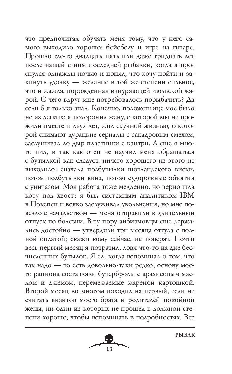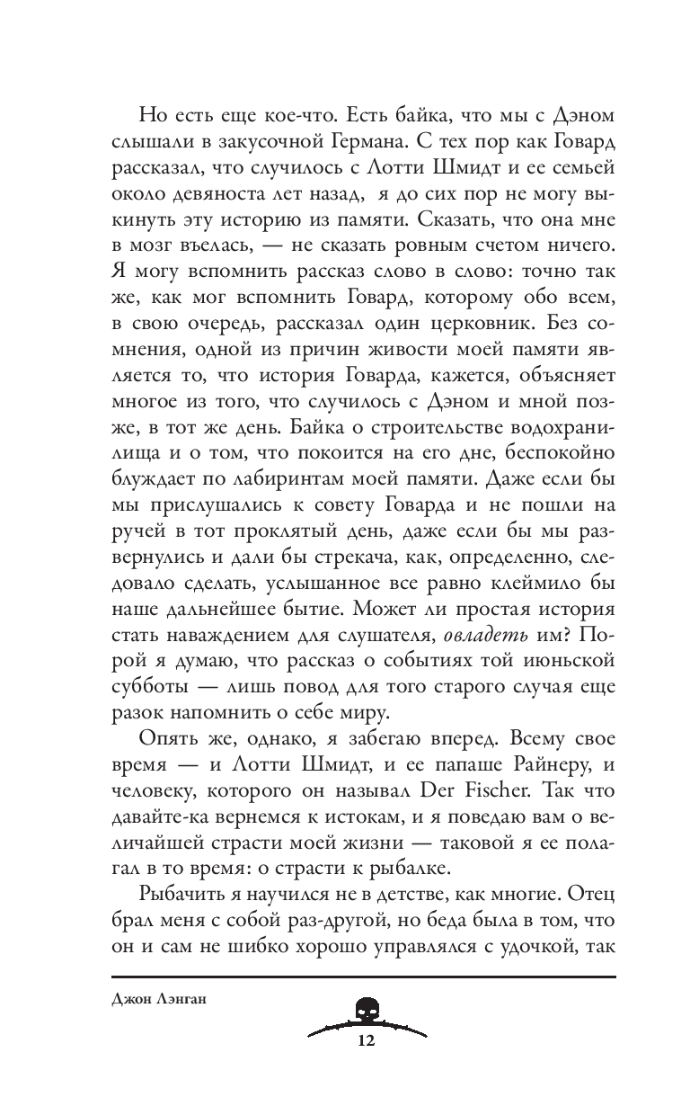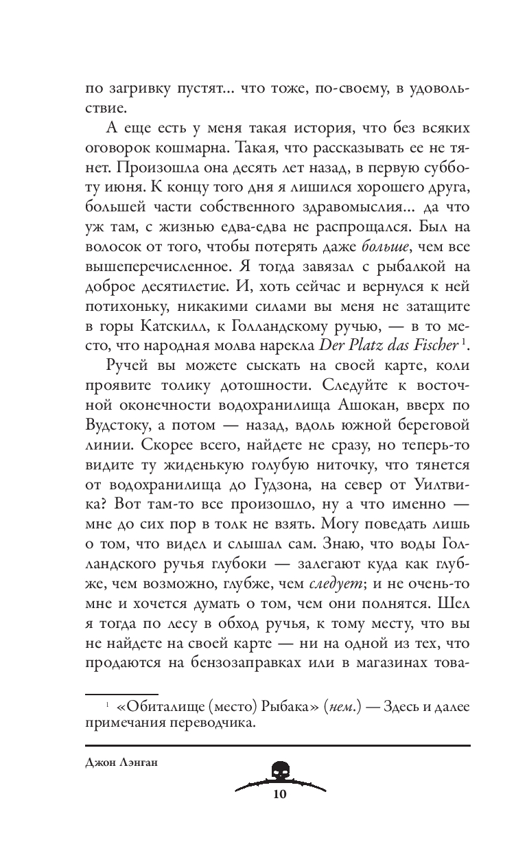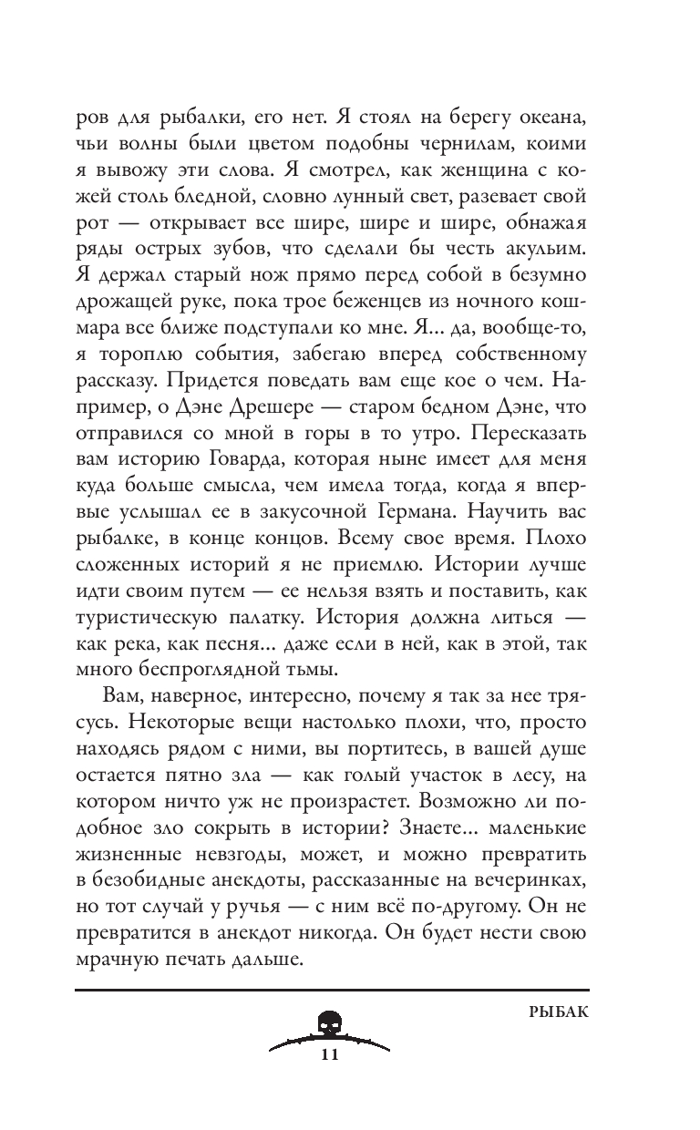 Голландский ручей – прекрасное место для рыбалки, живописный лесной уголок вдали от бесконечной суеты современной цивилизации. С ним связаны причудливые легенды о таинственном Рыбаке и о чудовищах, которых он ловил. Когда сюда приезжают Эйб и Дэн, два вдовца, потерявших все самое дорогое в жизни, эти слухи кажутся им лишь очередной байкой, но постепенно рассказ о страшных событиях, которые случились в городе поблизости около века назад, о Рыбаке, монстрах и мертвецах вовлекает героев в историю мрачнее любого омута. Друзья еще не знают, что местные воды гораздо глубже, чем кажутся, и ведут в пространства, неподвластные человеку; что древние тайны не умерли до сих пор; что ад всегда рядом, а тем, кто отчаялся, вскоре выпадет шанс встретиться со всем, что они потеряли. Вот только плата за эту встречу будет непомерной.
