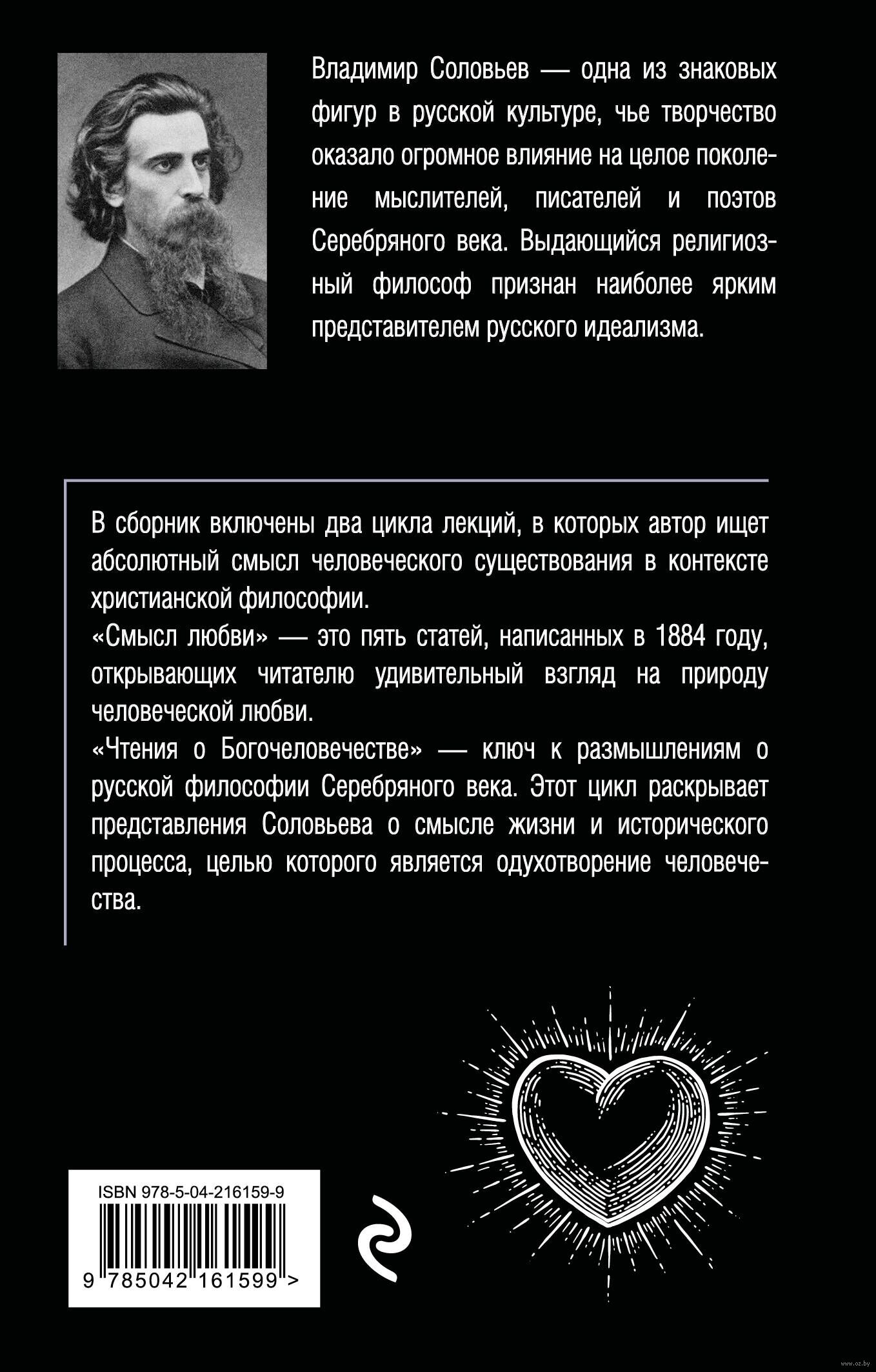 В книге представлены два цикла лекций Владимира Соловьева, философское наследие которого оказало решающее влияние на развитие русской философии второй половины XIX – начала XX века. Книга "Смысл любви" раскрывает любовь не как способ продолжения рода, а как высшую форму связи между людьми, способ познания истины и основу для построения гармоничного общества. "Чтения о Богочеловечестве" помогают понять взгляды Соловьева на смысл жизни и суть исторического процесса, конечной целью и смыслом которого является одухотворение человечества. Соловьев ищет абсолютный смысл земного бытия, пытаясь понять, как любовь и признание богочеловечества влияют на судьбу человека и его отношение к вечности.