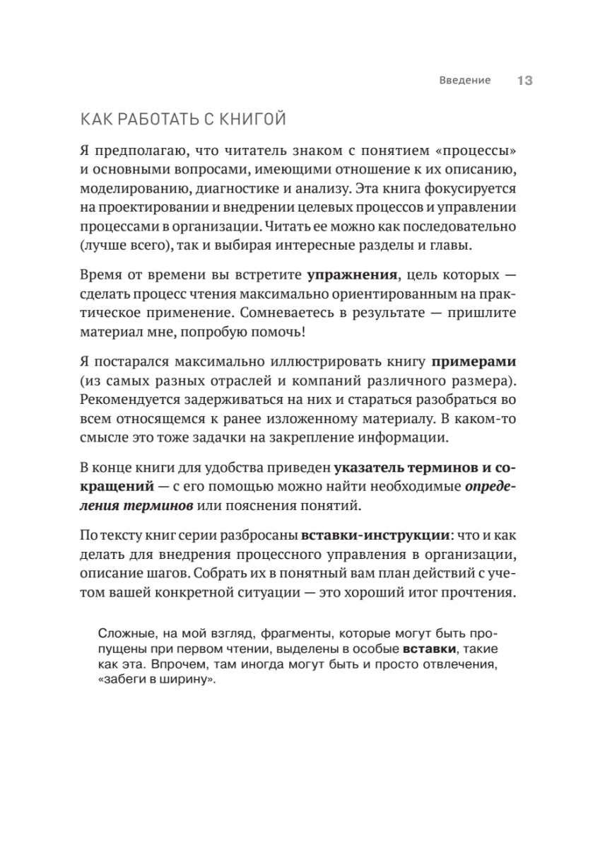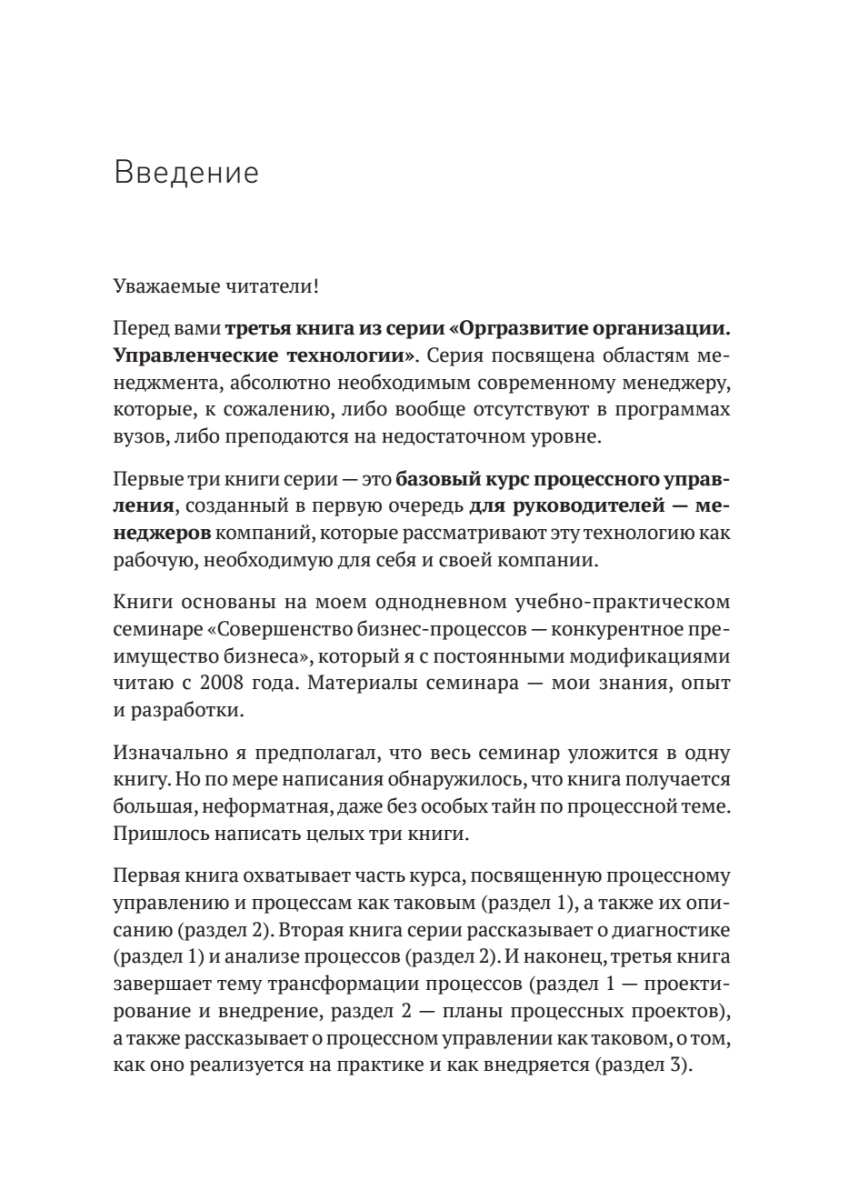 Данная книга завершает тему трансформации процессов (раздел 1: проектирование и внедрение, раздел 2: планы проектов), а также говорит о процессном управлении как таковом, о том, как оно реализуется на практике и как внедряется (раздел 3). Кроме того, приведены кейсы различных компаний на их пути к процессному управлению.