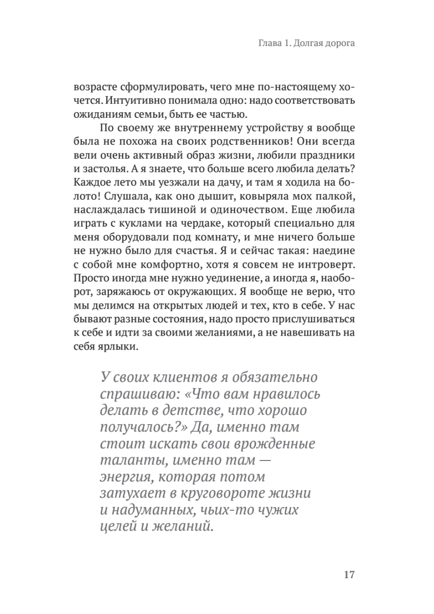 В книге описана авторская методика, объединяющая 20-летний опыт работы с людьми, коучинговые техники, практики работы с мышлением и подсознанием, бизнес-инструменты, а также методики продюсирования и режиссуры. На собственном примере и кейсах своих клиентов автор показывает, как читатель может самостоятельно пройти путь от непонимания своего места в мире до полной реализации заложенного в нем потенциала.