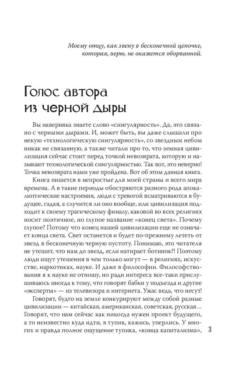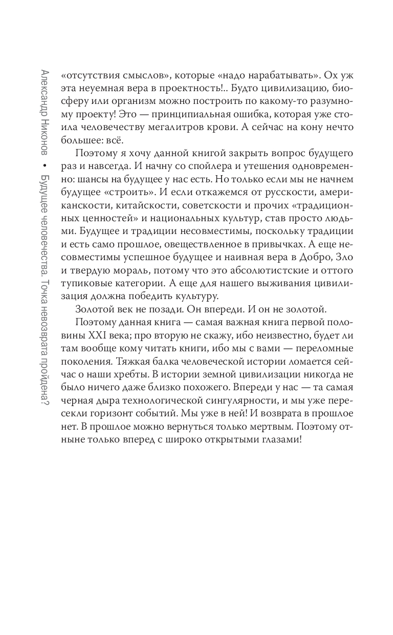 Нам говорят, будто на Земле конкурируют между собой разные цивилизации – российская, англосаксонская, китайская, христианская, исламская. Утверждают, будто нам сейчас как никогда нужен проект будущего. Это неправда. Цивилизация на планете всего одна. А любые проекты будущего априори провальны и ведут к катастрофе, потому что земная цивилизация находится в состоянии технологической сингулярности и мы уже пересекли горизонт исторических событий. Пути в прошлое нет, и оглядываться поздно – теперь только вперед! Золотой век не позади. Он впереди, и он не золотой.