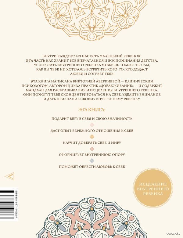 Эта книга написана Викторией Аверкиевой – клиническим психологом, автором цикла практик "Добаюкивание" – и содержит мандалы для раскрашивания и исцеления внутреннего ребенка. Они помогут тебе сконцентрироваться на себе, уделить внимание и дать признание своему внутреннему ребенку.