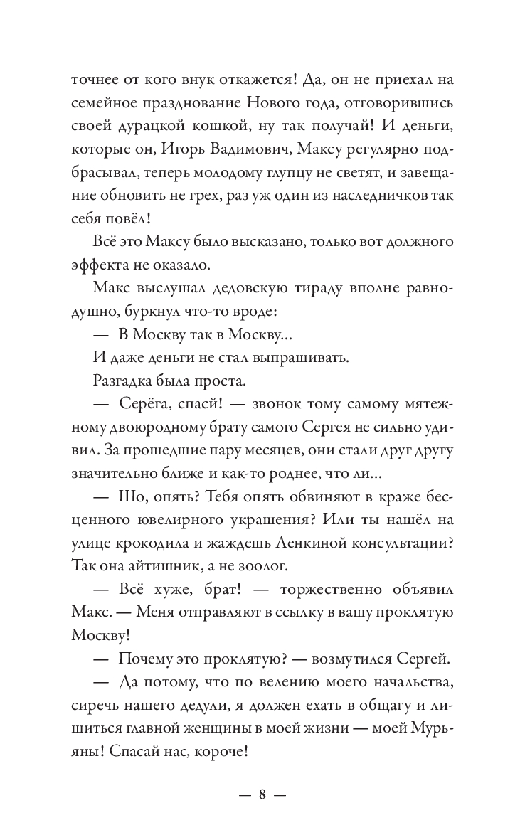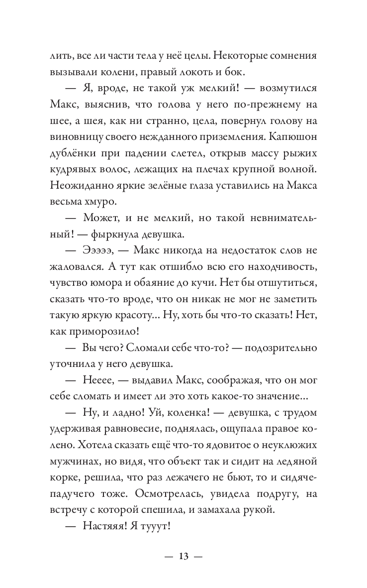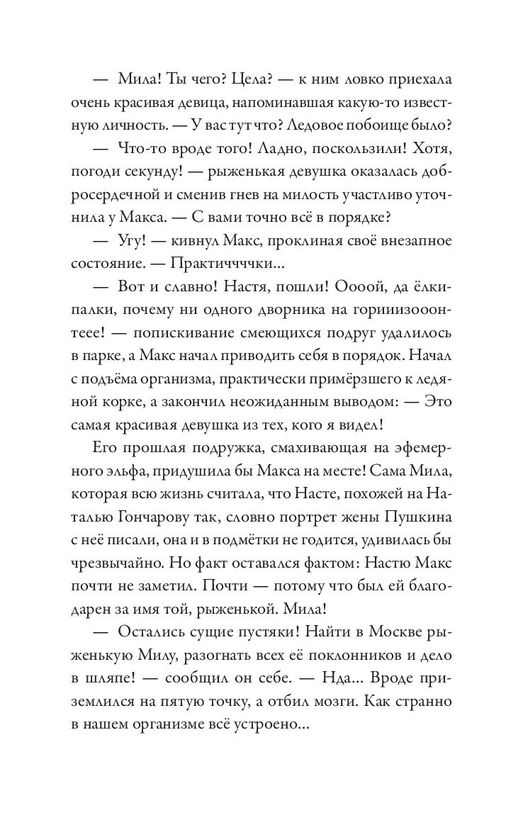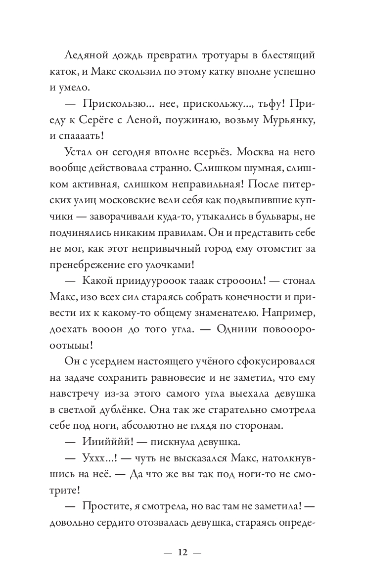 Макс – из тех, кто все делает неправильно. Бросить престижную работу ради подобранного на улице котенка и быть сосланным из любимого Петербурга в чужую зимнюю Москву? Легко! Влюбиться с первого взгляда в рыжеволосую незнакомку в огромном незнакомом городе? Запросто! Искать ее, раз за разом натыкаясь на тупики? Вполне вероятно! Найти, полюбить еще сильнее и оказаться разделенными городами? С Максом все возможно! Главное – понять себя: чего он хочет? Благополучную карьеру под крылом влиятельного деда или рыжеволосую Милу, забавную полосатую кошку Мурьяну и, самое главное, себя самого? Нева и Москва-река никогда не соединятся, но люди – не реки. Максу предстоит сделать выбор и решить, как ему жить, для чего и с кем.