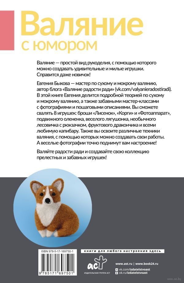 В этой книге представлено 8 мастер-классов по валянию милых и забавных игрушек. Вы сможете создать броши "Лисичка", "Корги", "Фотоаппарат", подвижного олененка, веселого лягушонка, необычного лесовичка с рюкзачком, фруктового дракончика и всеми любимую капибару! Также вы освоите различные техники валяния, с помощью которых можно создавать свои работы. А веселые фотографии точно поднимут вам настроение!