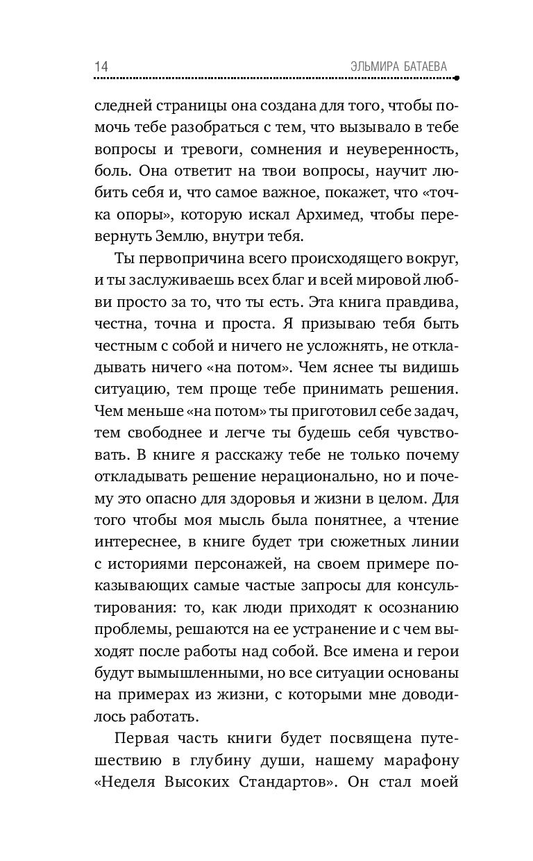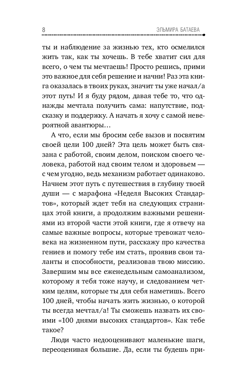 Авторский марафон "Неделя Высоких Стандартов" в первой части книги – это настоящая философия, которая поможет вам поверить в себя, лучше узнать свои особенности, таланты, потенциал, ценности и мечты. Найти то призвание, ради которого вы пришли в этот мир.