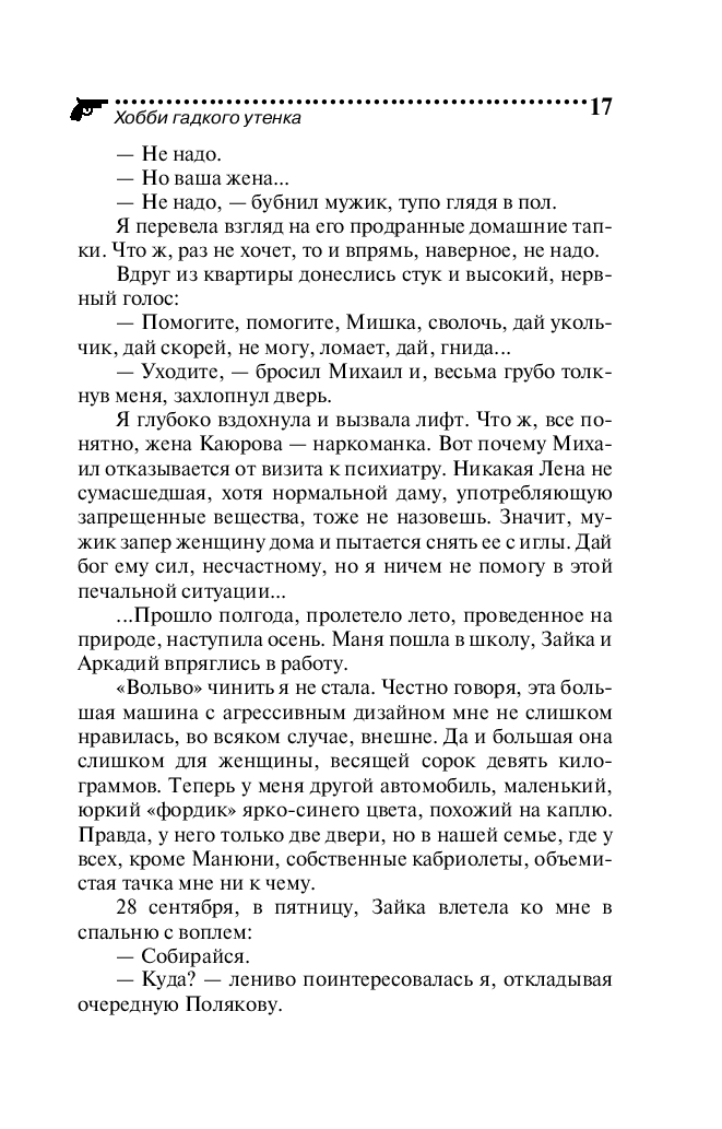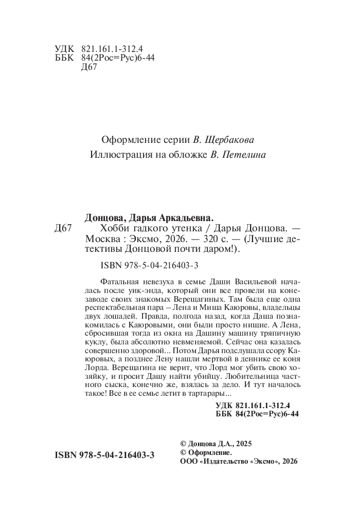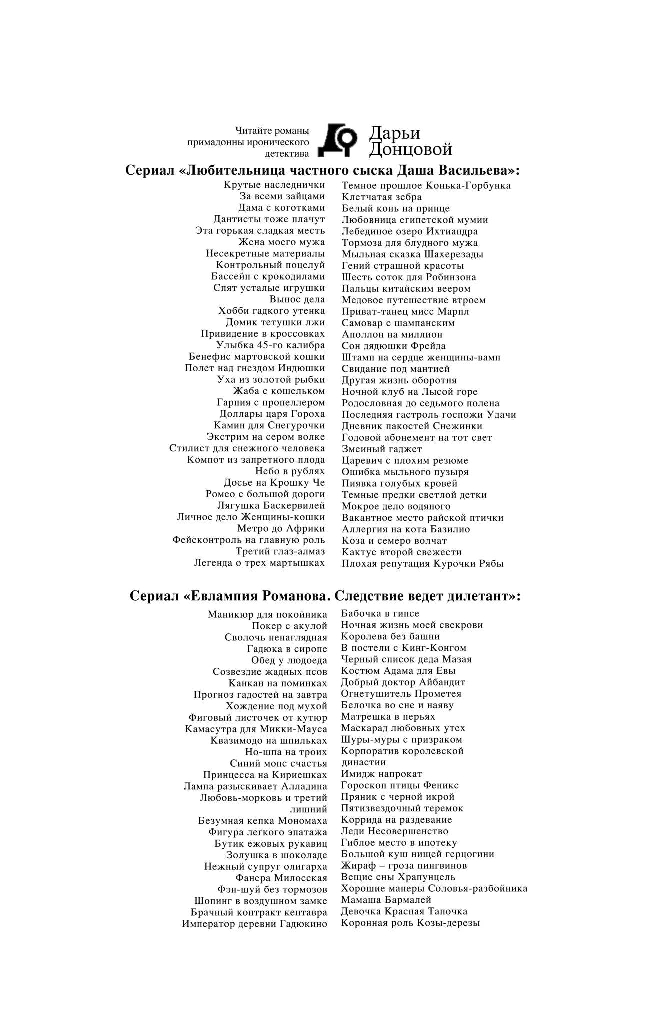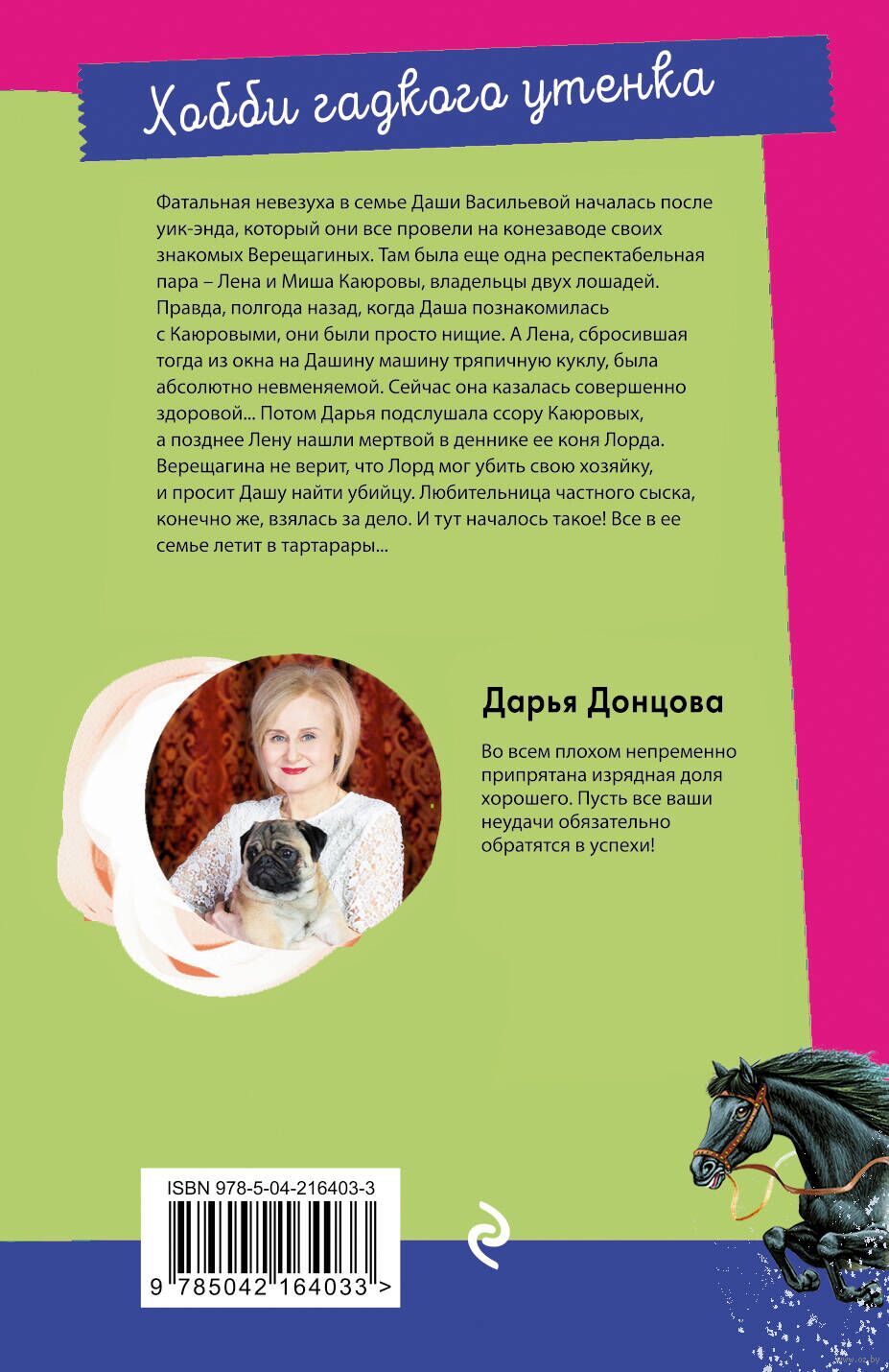 Фатальная невезуха в семье Даши Васильевой началась после уик-енда, который они все провели на конезаводе своих знакомых Верещагиных. Там была еще одна респектабельная пара – Лена и Миша Каюровы, владельцы двух лошадей. Правда, полгода назад, когда Даша познакомилась с Каюровыми, они были просто нищие. А Лена, сбросившая тогда из окна на Дашину машину тряпичную куклу, была абсолютно невменяемой. Сейчас она казалась совершенно здоровой... Потом Дарья подслушала ссору Каюровых, а позднее Лену нашли мертвой в деннике ее коня Лорда. Верещагина не верит, что Лорд мог убить свою хозяйку, и просит Дашу найти убийцу. Любительница частного сыска, конечно же, взялась за дело. И тут началось такое! Все в ее семье летит в тартарары...