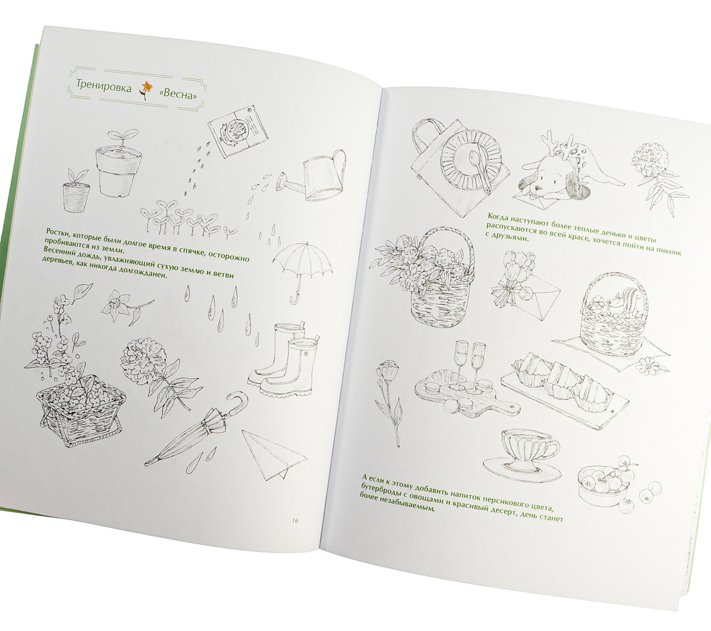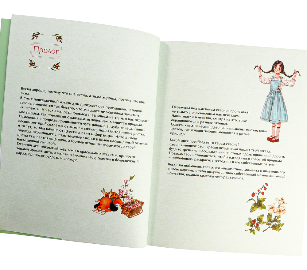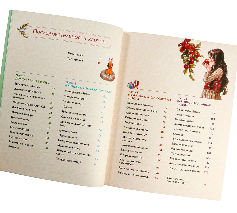 "Раскраска по временам года от Aeppol" объединяет знания и опыт, накопленные за годы создания успешных раскрасок. В ней представлены не только красивые рисунки, включая последние работы, но и персонажи, а также сезонные мини-рисунки, которые помогут вам практиковать раскрашивание. Всего более 100 иллюстраций, среди которых есть специальные разделы для тренировки.