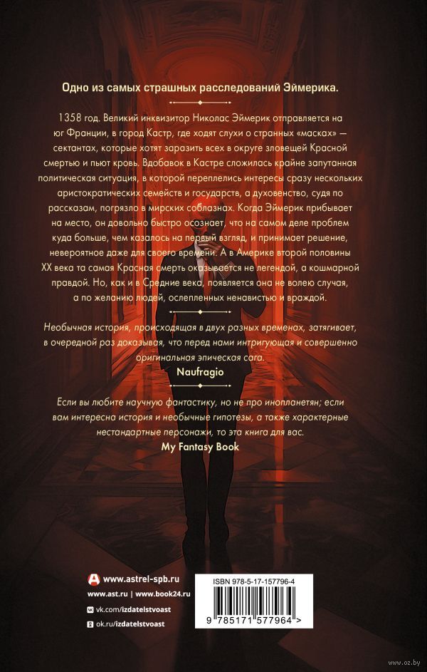 1358 год. Великий инквизитор Николас Эймерик отправляется на юг Франции, в город Кастр, где ходят слухи о странных "масках" – сектантах, которые хотят заразить всех в округе зловещей Красной смертью и пьют кровь. Вдобавок в Кастре сложилась крайне запутанная политическая ситуация, в которой переплелись интересы сразу нескольких аристократических семейств и государств, а духовенство, судя по рассказам, погрязло в мирских соблазнах. Когда Эймерик прибывает на место, он довольно быстро осознает, что на самом деле проблем куда больше, чем казалось на первый взгляд, и принимает решение, невероятное даже для своего времени. А в Америке второй половины XX века та самая Красная смерть оказывается не легендой, а кошмарной правдой. Но, как и в Средние века, появляется она не волею случая, а по желанию людей, ослепленных ненавистью и враждой.