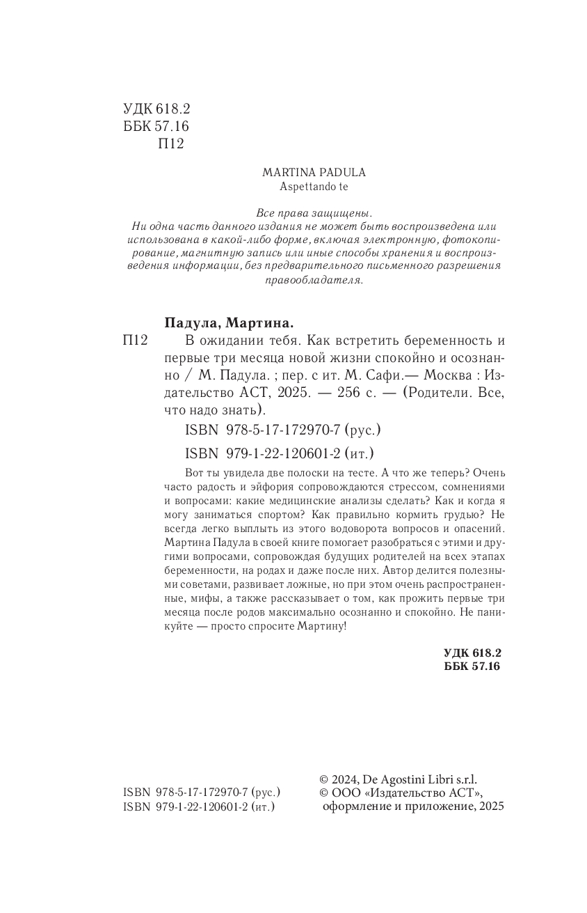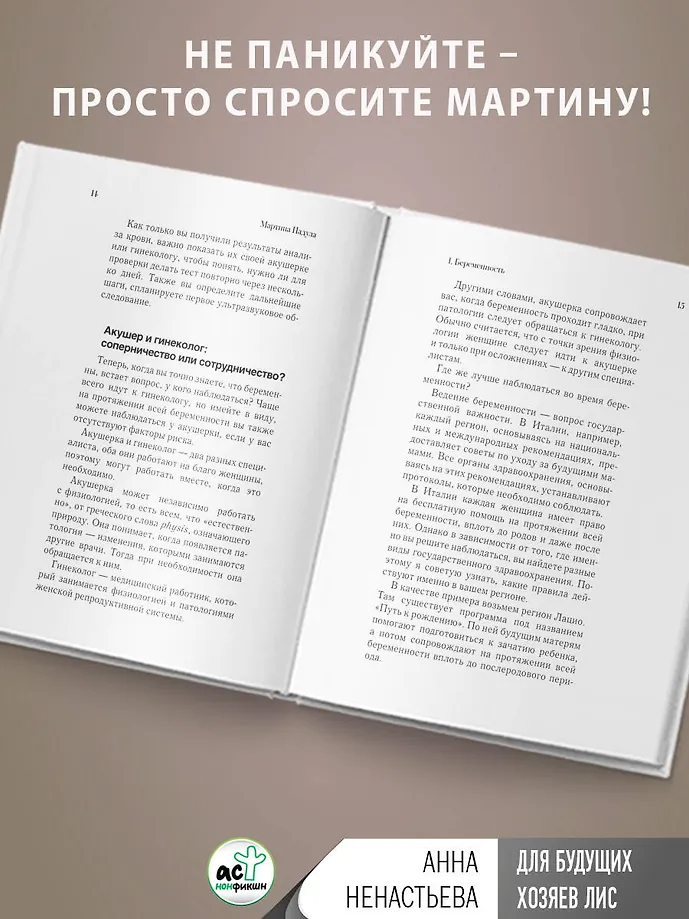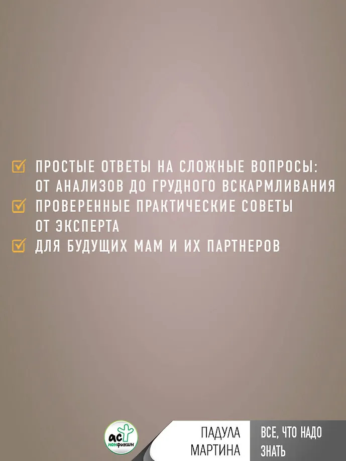 Вот ты увидела две полоски на тесте. А что же теперь? Очень часто радость и эйфория сопровождаются стрессом, сомнениями и вопросами: какие медицинские анализы сделать? Как и когда я могу заниматься спортом? Как правильно кормить грудью? Не всегда легко выплыть из этого водоворота вопросов и опасений. Мартина Падула в своей книге помогает разобраться с этими и другими вопросами, сопровождая будущих родителей на всех этапах беременности, на родах и даже после них. Автор делится полезными советами, развивает ложные, но при этом очень распространенные, мифы, а также рассказывает о том, как прожить первые три месяца после родов максимально осознанно и спокойно. Не паникуйте – просто спросите Мартину!
