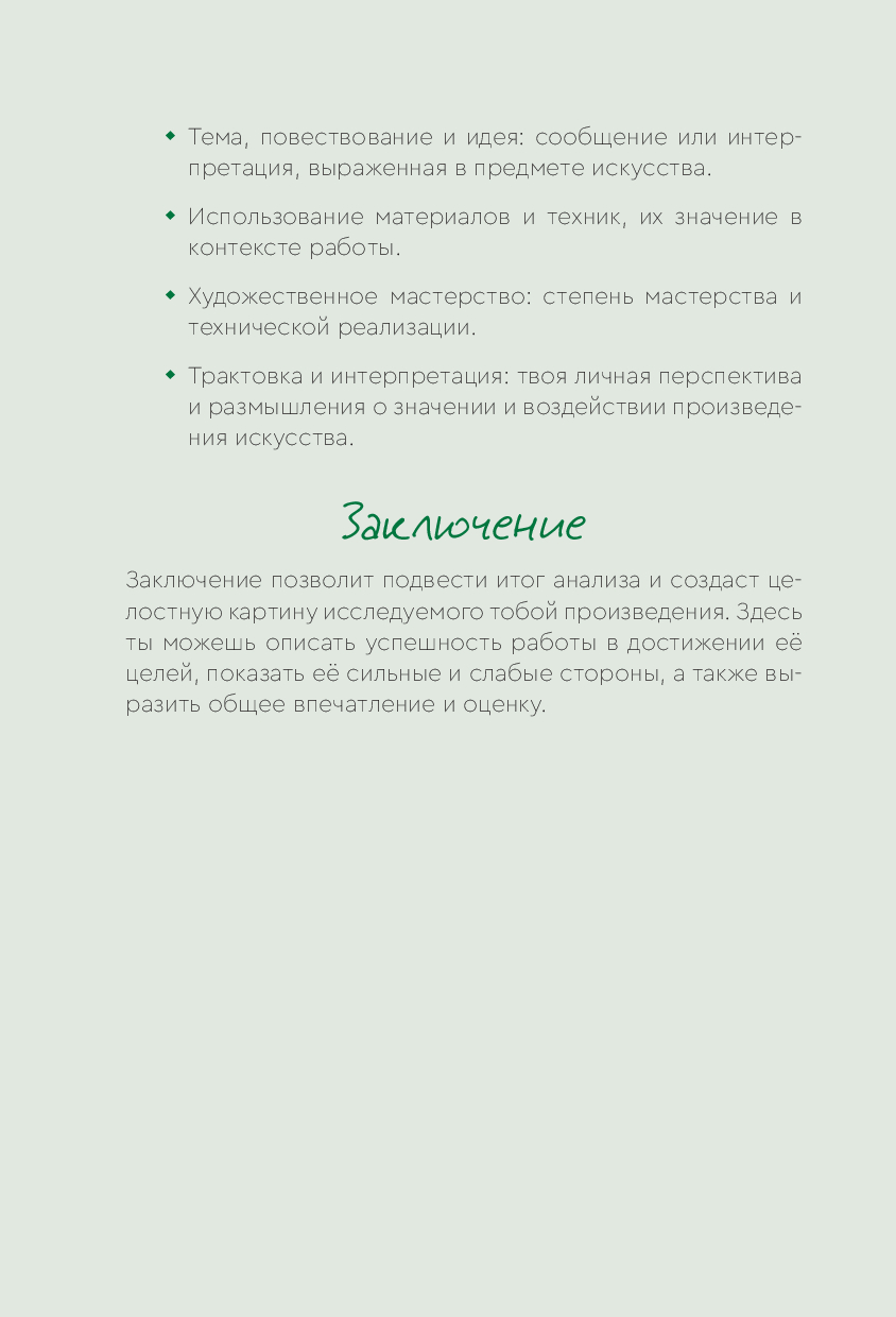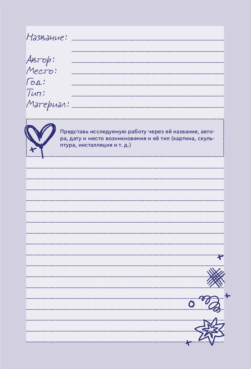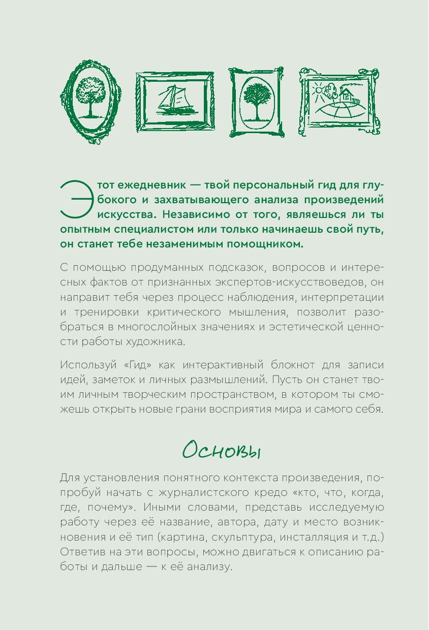 В тетради вопросы, задания и идеи для размышлений, которые помогут вам самим разобраться в картинах и почувствовать дух времени. "Гид по искусству" создан для тех, кто хочет узнать о нем больше без скучных лекций!