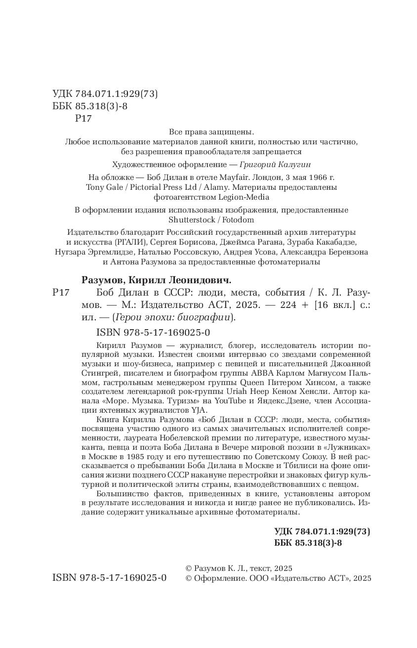 Книга Кирилла Разумова "Боб Дилан в СССР: люди, места, события" посвящена участию одного из самых значительных исполнителей современности, лауреата Нобелевской премии по литературе, известного музыканта, певца и поэта Боба Дилана в Вечере мировой поэзии в "Лужниках" в Москве в 1985 году и его путешествию по Советскому Союзу. В ней рассказывается о пребывании Боба Дилана в Москве и Тбилиси на фоне описания жизни позднего СССР накануне перестройки и знаковых фигур культурной и политической элиты страны, взаимодействовавших с певцом.