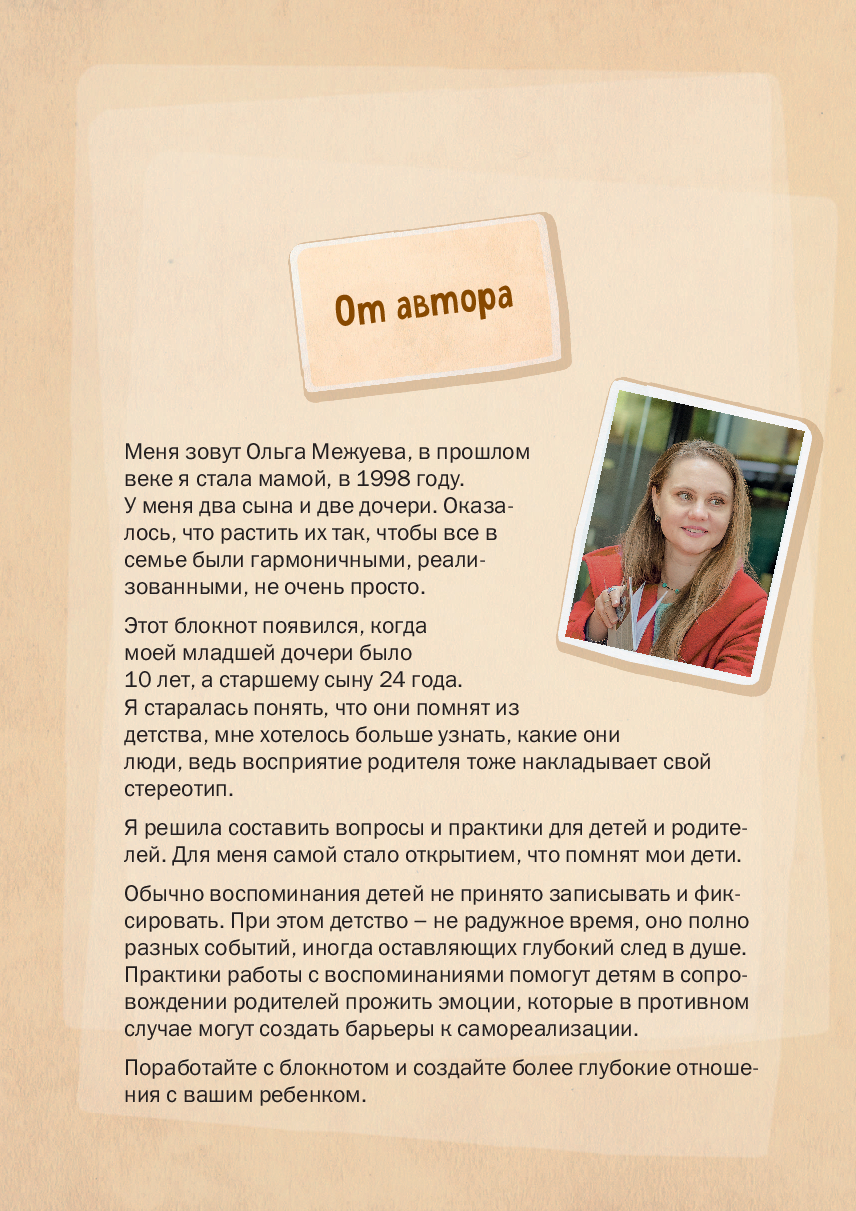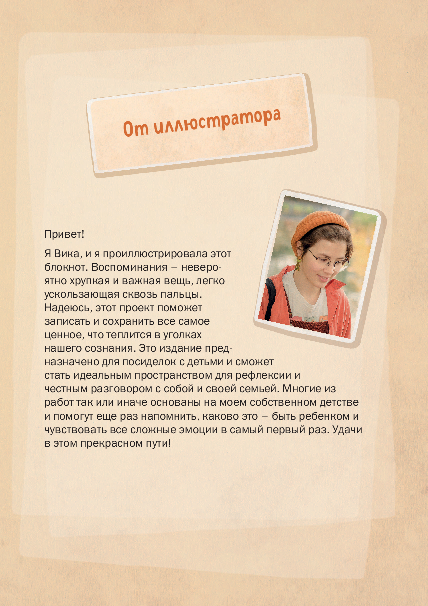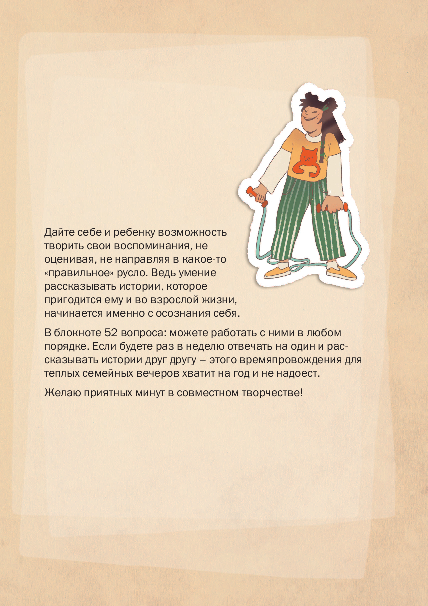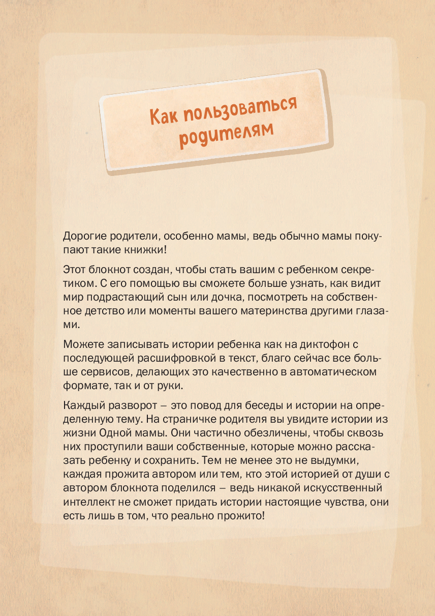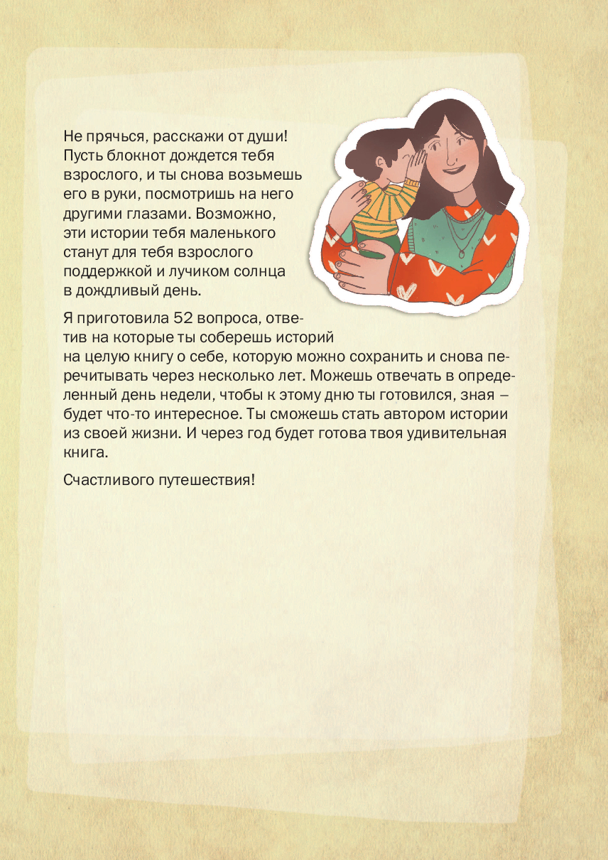 Когда живое общение все чаще заменяется интернетом и мессенджерами, важно сохранять драгоценные минуты, проведенные друг с другом рядом. Этот блокнот семейных историй позволит детям узнать лучше своих родителей, а родителям – сблизиться с детьми и сберечь их воспоминания. А также поможет наладить отношения, научиться более чутко понимать друг друга и создать коллекцию историй, которые лягут в основу вашей будущей семейной летописи.