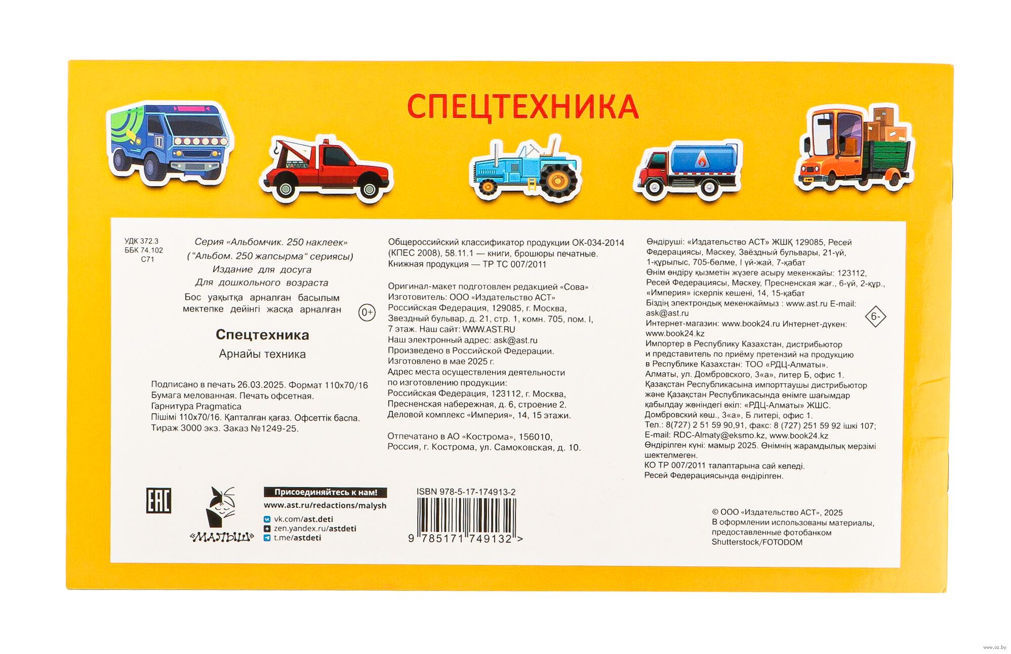 "Спецтехника" – это более 250 стикеров и 6 страниц цветных фонов для безграничной детской фантазии. Играя с книжкой, мальчишки познакомятся с автомобильной техникой, узнают названия машин-помощников. Весёлые уроки окружающего мира развивают воображение, память и внимание, способствуют развитию речи, зрительного восприятия и мелкой моторики. Книга с мелованными страницами отличного качества – поэтому стикеры можно наклеивать много раз!