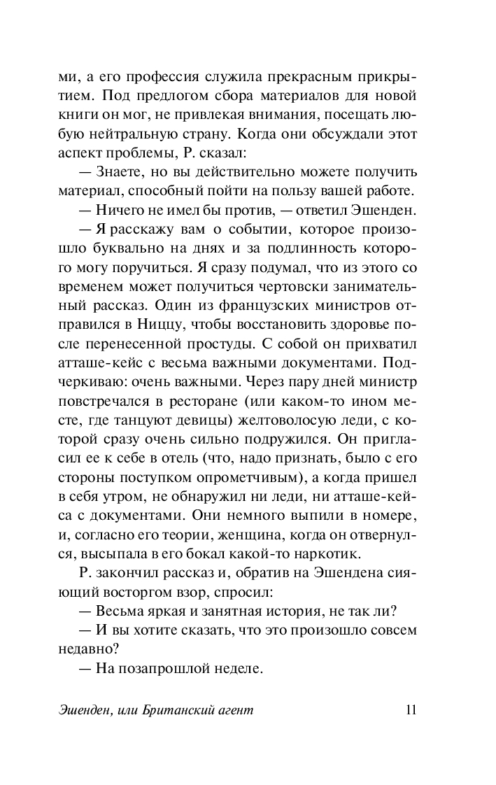 Разгар Первой мировой войны. Идут ожесточенные бои на фронтах, а в тылу разворачивается тайное противостояние европейских разведок, в которое оказывается втянут писатель, завербованный британской секретной службой. Эшенден – идеальная кандидатура для разведывательной работы, он наблюдателен, спокоен и с виду безобиден, владеет несколькими европейскими языками, а его профессия может послужить идеальным прикрытием. Эшенден, меняя одну личину за другой, не привлекая внимания, посещает разные страны, добывает и передает сведения, сопровождает и вербует агентов. Он наблюдает за началом, иногда за серединой или концом тайной операции, но почти никогда не знает всей истории.