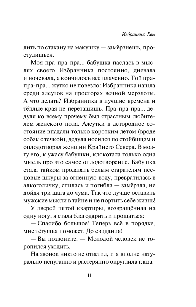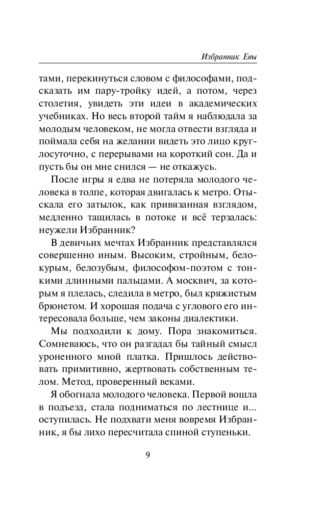 …В девичьих мечтах Избранник представлялся совершенно иным. Высоким, стройным, белозубым философом-поэтом с тонкими длинными пальцами. А москвич, за которым Ева плелась в метро, был крепким брюнетом. И хорошая подача с углового его интересовала больше, чем законы диалектики. Но Ева знала один секрет: мужчины выбирают, будучи давно выбранными...