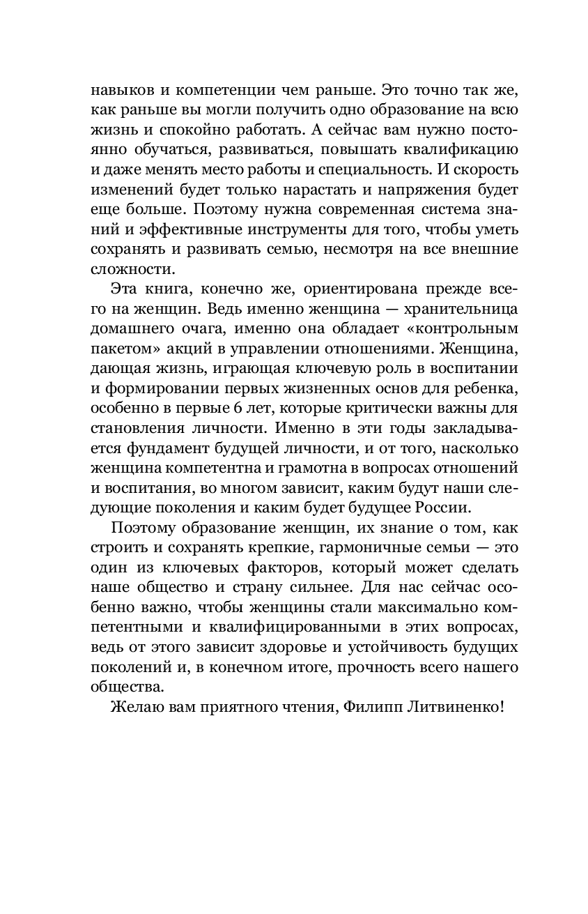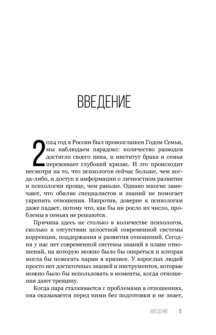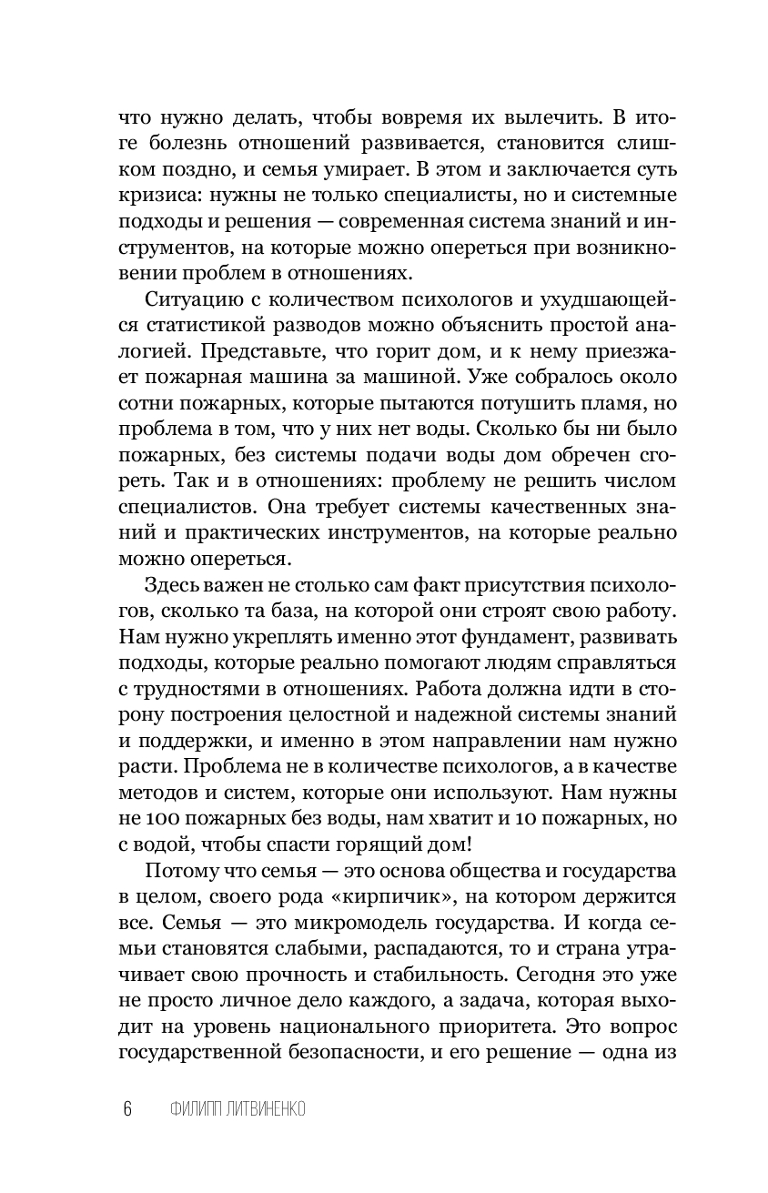 "Сегодня мы наблюдаем критический парадокс: психологов и консультантов в теме отношений с каждым днем становится все больше и больше, а статистика разводов все хуже и хуже. Количество разводов в нашей стране уже достигло своего пика, и институт брака и семьи переживает глубокий кризис. И главная проблема в том, что у психологов нет целостной современной системы коррекции, поддержания и развития отношений. И каждый обучает как-то по-своему, по старинке опираясь на свой личный, субъективный опыт или пересказывая книги психологов более старшего поколения. Но времена изменились! Долгое время у нас не было современной системы знаний в плане отношений, на которую можно было бы опереться и которая могла бы помогать парам в кризисе. У взрослых людей просто нет достаточных знаний и инструментов, которые можно было бы использовать в моменты, когда отношения дают трещину. И именно такую современную систему знаний я открываю вам в этой книге". Ф. Литвиненко