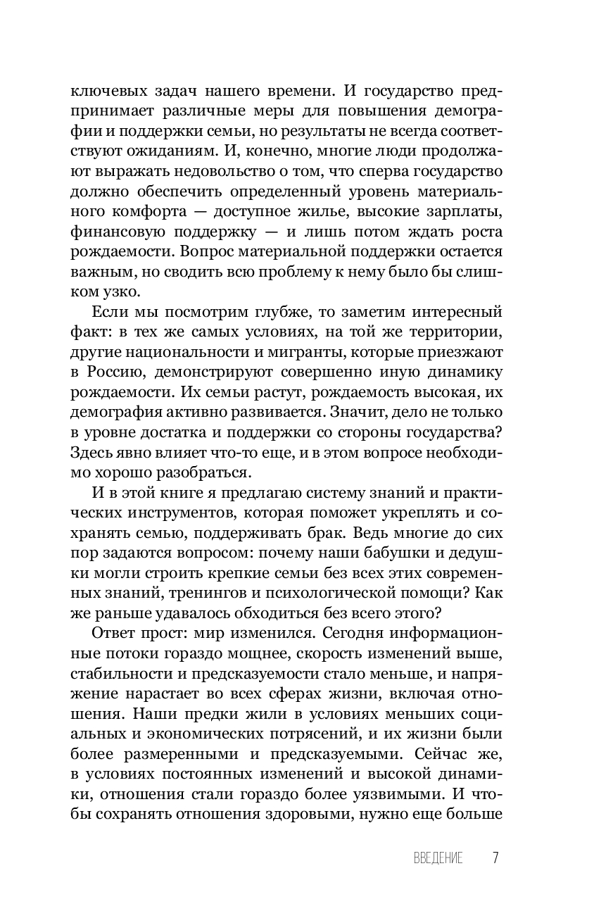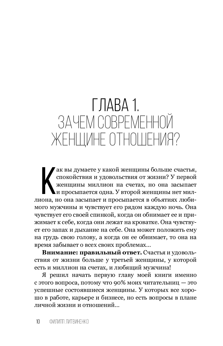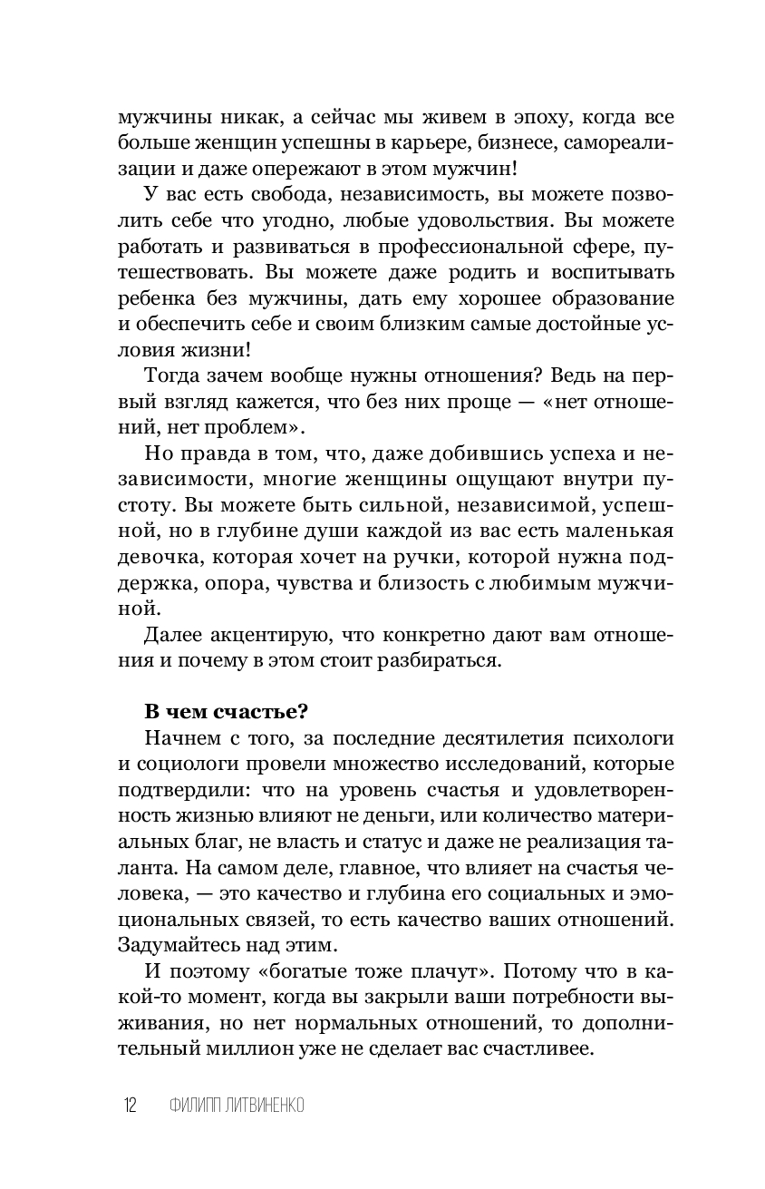 "Сегодня мы наблюдаем критический парадокс: психологов и консультантов в теме отношений с каждым днем становится все больше и больше, а статистика разводов все хуже и хуже. Количество разводов в нашей стране уже достигло своего пика, и институт брака и семьи переживает глубокий кризис. И главная проблема в том, что у психологов нет целостной современной системы коррекции, поддержания и развития отношений. И каждый обучает как-то по-своему, по старинке опираясь на свой личный, субъективный опыт или пересказывая книги психологов более старшего поколения. Но времена изменились! Долгое время у нас не было современной системы знаний в плане отношений, на которую можно было бы опереться и которая могла бы помогать парам в кризисе. У взрослых людей просто нет достаточных знаний и инструментов, которые можно было бы использовать в моменты, когда отношения дают трещину. И именно такую современную систему знаний я открываю вам в этой книге". Ф. Литвиненко