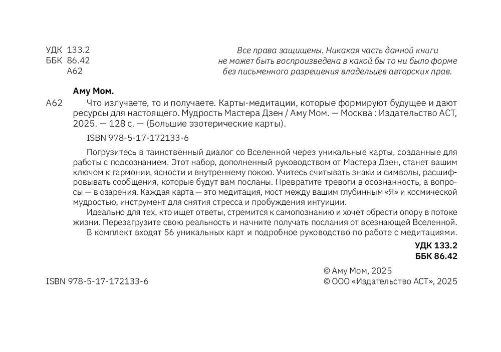 Внутри 56 ценных карт-знаков и подробное руководство по работе с медитациями.