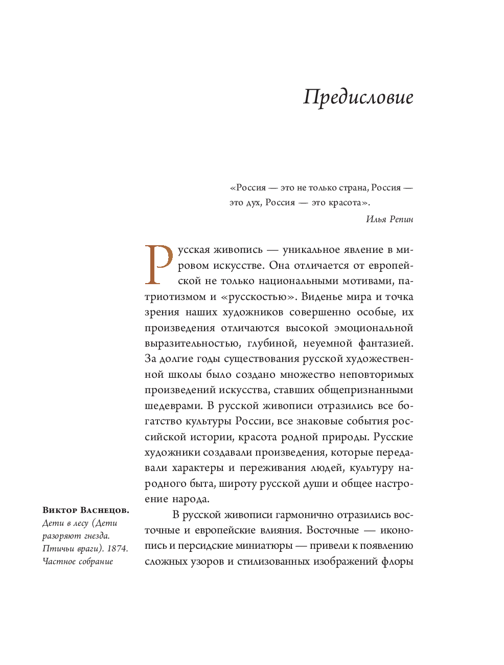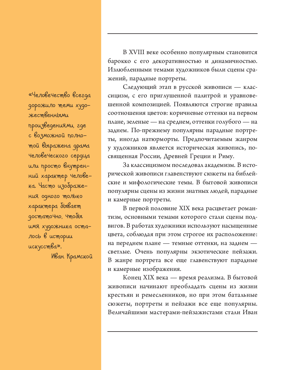 Русская живопись XVII–XIX веков поражает и радует своим разнообразием жанров, техник и стилей. Это и парадные портреты знати, а также камерные, интимные женские изображения кисти Владимира Боровиковского, полные красоты и очарования пейзажи родной земли Ивана Шишкина, Алексея Саврасова, монументальные исторические полотна Карла Брюллова, Василия Сурикова и Ильи Репина, реалистичные батальные сцены Василия Верещагина, величественные и эмоциональные марины Ивана Айвазовского, остросюжетные бытовые сцены Константина Маковского, яркие жанровые картины Кустодиева. Этот красочный альбом со множеством великолепных иллюстраций на мелованной бумаге позволит познакомиться со всем многообразием русской живописи.