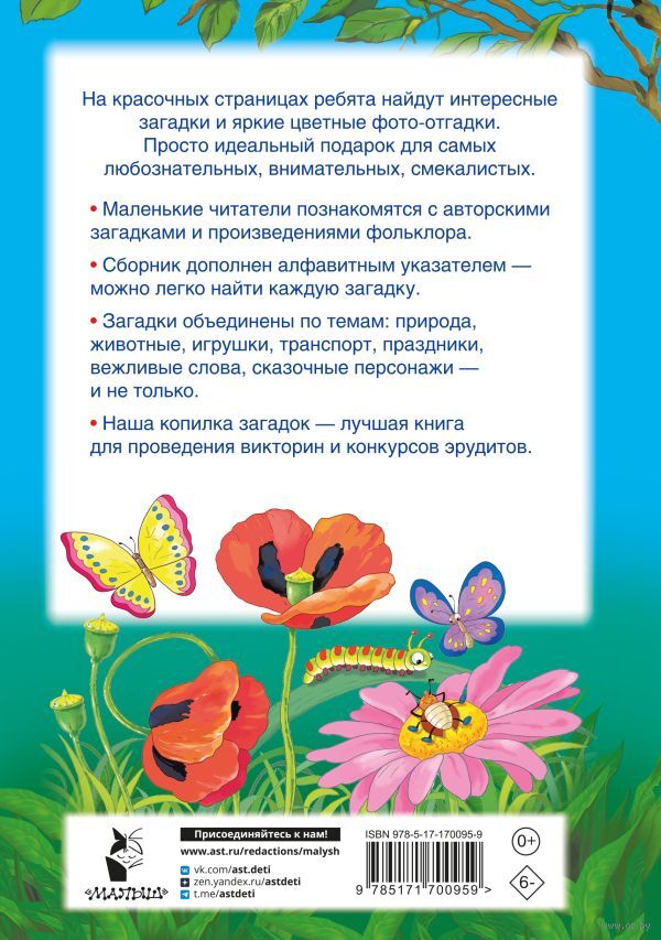 "1001 загадка" – прекрасно иллюстрированная книга удобного компактного формата. На красочных страницах ребята найдут интересные загадки и яркие цветные фото-отгадки. В книге собраны как авторские загадки, так и произведения фольклора. Просто идеальный подарок для самых любознательных, внимательных, смекалистых. Ведь разгадывать загадки – самый увлекательный способ познавать этот мир! Детвора и взрослые замечают сходство и различия, воображают и мыслят яркими образами, и конечно, все в восторге, когда отгадка найдена. Такое увлекательное занятие не только доставляет радость, но приносит огромную пользу. Ребёнок сможет развить речь, память, логику и образное мышление, расширить кругозор и обогатить словарный запас, а также весело провести время.