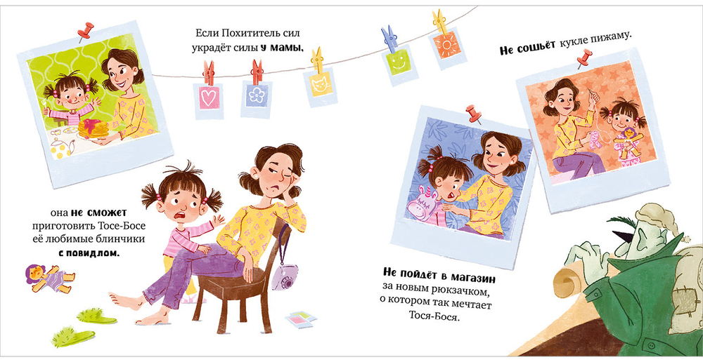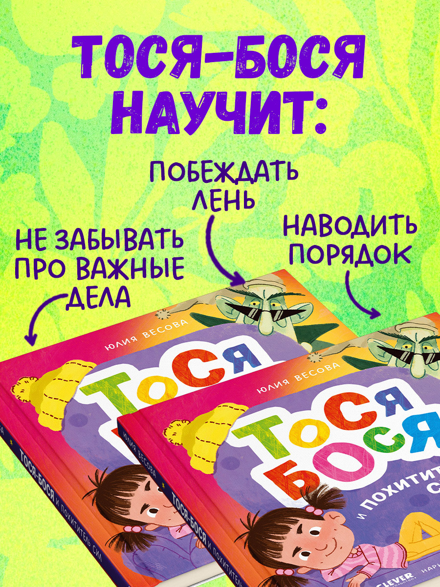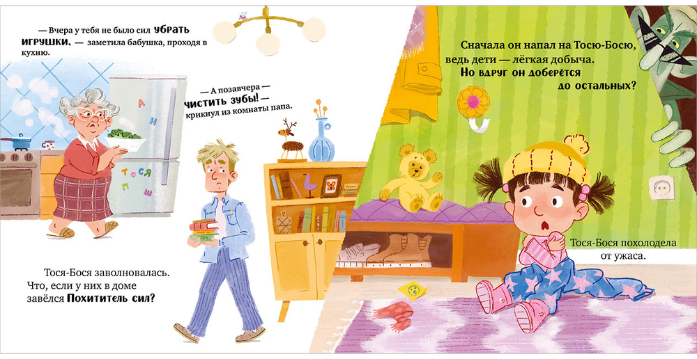 Тося-Бося может часами играть, бегать, летать с горки. Ее энергия неиссякаема… Но стоит Тосе-Босе подумать о мытье рук и чистке зубов, как ее силы вдруг пропадают. Кажется, во всем виноват коварный Похититель сил! Что, если он доберется до мамы и она не сможет печь блинчики из-за упадка сил? Или до папы? До бабушки? Тося-Бося полна решимости победить негодяя.
