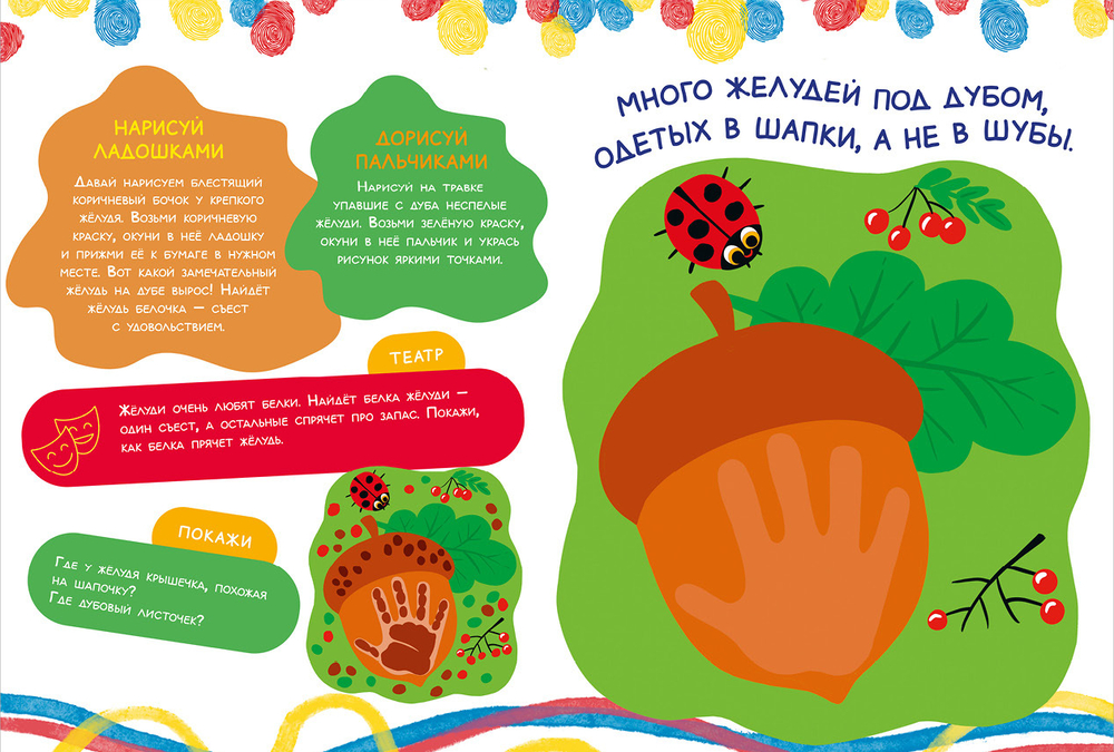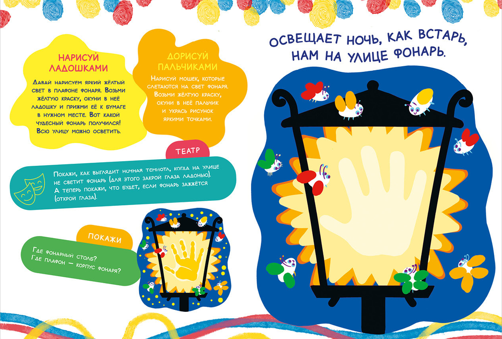 "Рисуем ладошками и пальчиками. 1–3 года" – это книжка-активити с заданиями для развития мелкой моторики, речи, памяти, внимания, ловкости и координации. И конечно, фантазии!