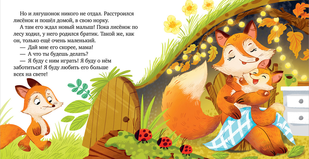 Маленький лисенок мечтал о младшем брате и сестре. Он пытался уговорить других лесных зверюшек отдать ему своих братьев или сестер, но никто не соглашался. Что же будет делать лисенок? А вот барсучата постоянно ссорятся и делят игрушки. Сумеют ли они договориться? Кротику мешала играть маленькая сестренка, и он сказал ей уйти. Но вот малышка потерялась… Что же сделает старший брат?