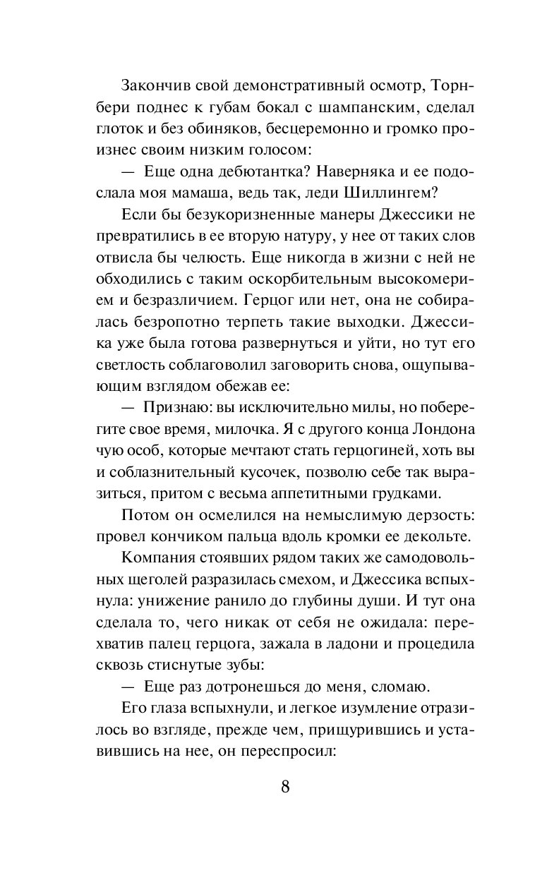 Эйден Торнтон, герцог Торнбери, – легкомысленный повеса, который и не думает остепениться. Одной мимолетной встречи с ним хватило, чтобы леди Джессика вычеркнула высокомерного грубияна из списка потенциальных женихов. Вот только Эйден не может забыть умную, дерзкую и острую на язык дебютантку, и вскоре герцог уже готов на все, лишь бы добиться любви и расположения девушки…