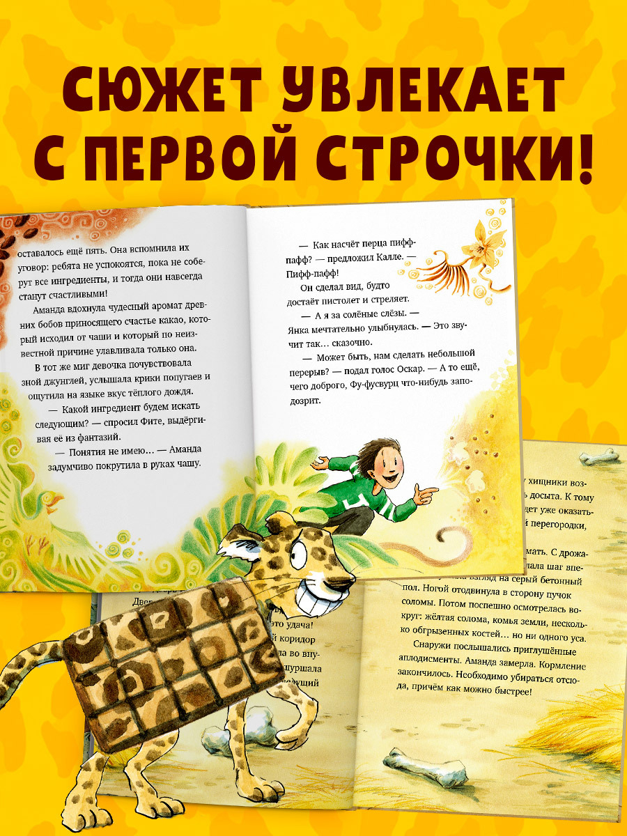 Аманда, Оскар и их друзья живут в приюте противной Агаты Фусвурц и там готовят знаменитый шоколад "Шоколадус". В первой части истории "Шоколадус. Секрет волшебного какао" ребята нашли рецепт легендарного напитка – какао счастья! Во второй части "Шоколадус. Тайна золотой ванили" они искали один из ингредиентов – стручок редкой золотой ванили. И вот в третьей части "Шоколадус. Секрет ягуара" им предстоит отыскать еще одну составляющую напитка – ус ягуара. Друзья отправляются в зоопарк. Их план опасен. Смогут ли они не упустить единственный шанс и добыть важный ингредиент для какао, которое принесет им счастье?