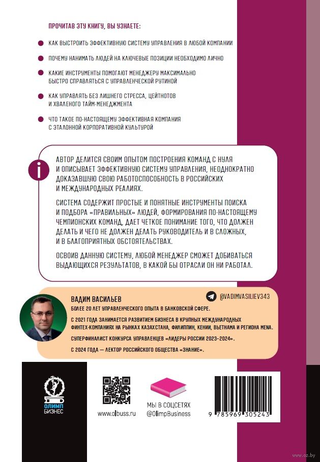 Вадим Васильев, менеджер с двадцатилетним стажем, суперфиналист конкурса управленцев "Лидеры России 2023–2024", делится своим опытом построения команд с нуля и описывает эффективную систему управления, неоднократно доказавшую свою работоспособность в российских и международных реалиях.