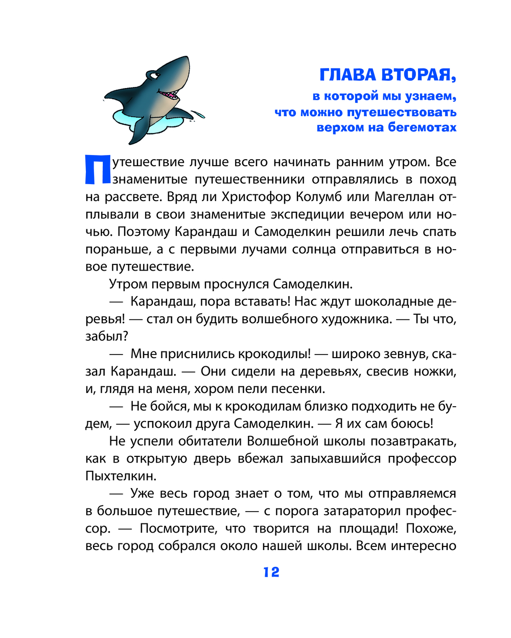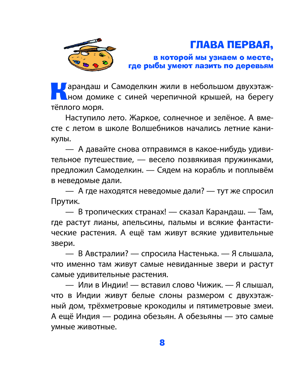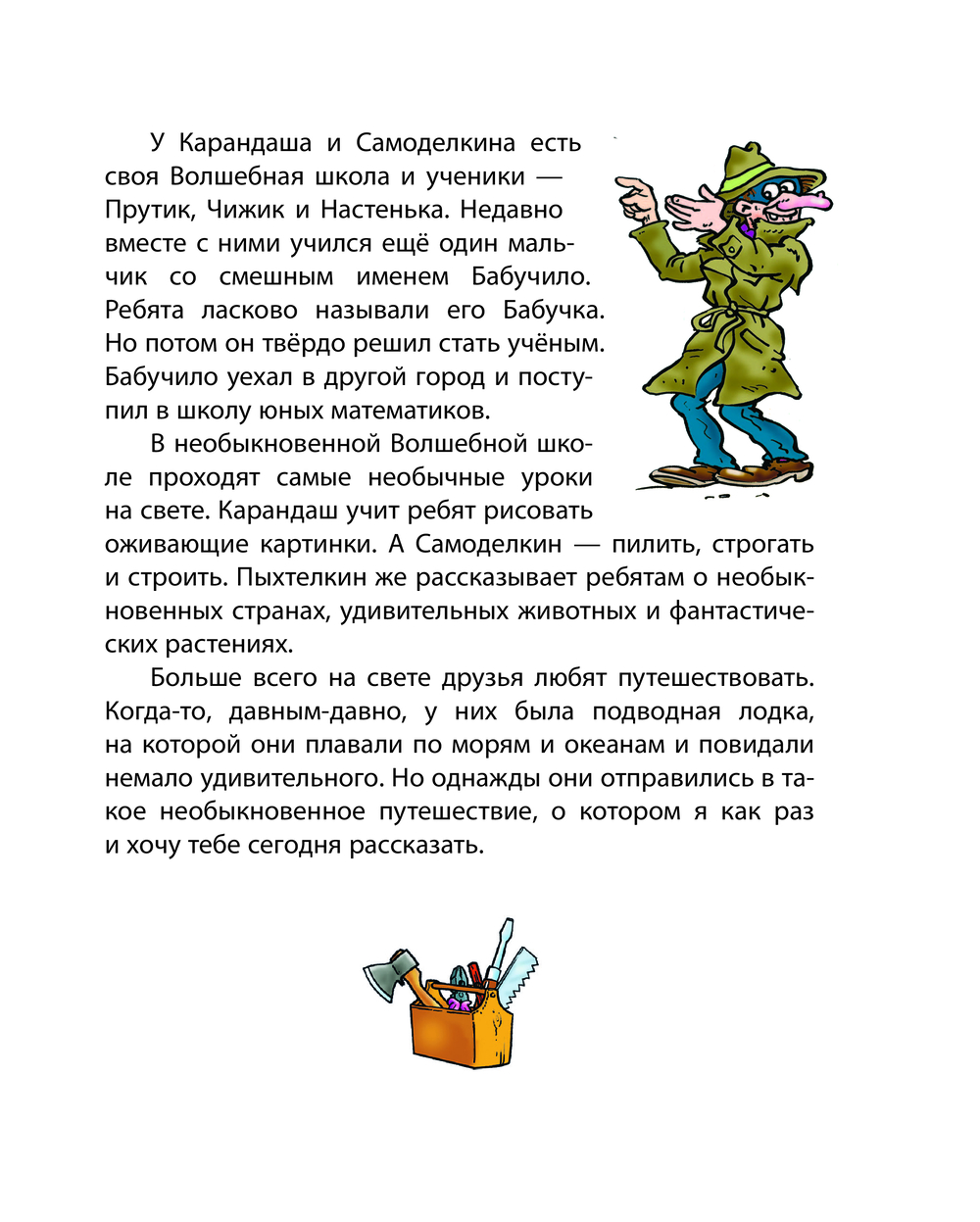 Сказочная повесть Валентина Постникова о необыкновенных приключениях волшебного художника Карандаша и железного мастера Самоделкина. Друзья отправляются в удивительную страну, где растут шоколадные деревья и обитают диковинные животные. Им предстоит совершить полёт на воздушном шаре, пройти сложное испытание на экваторе и даже встретить снежного человека.