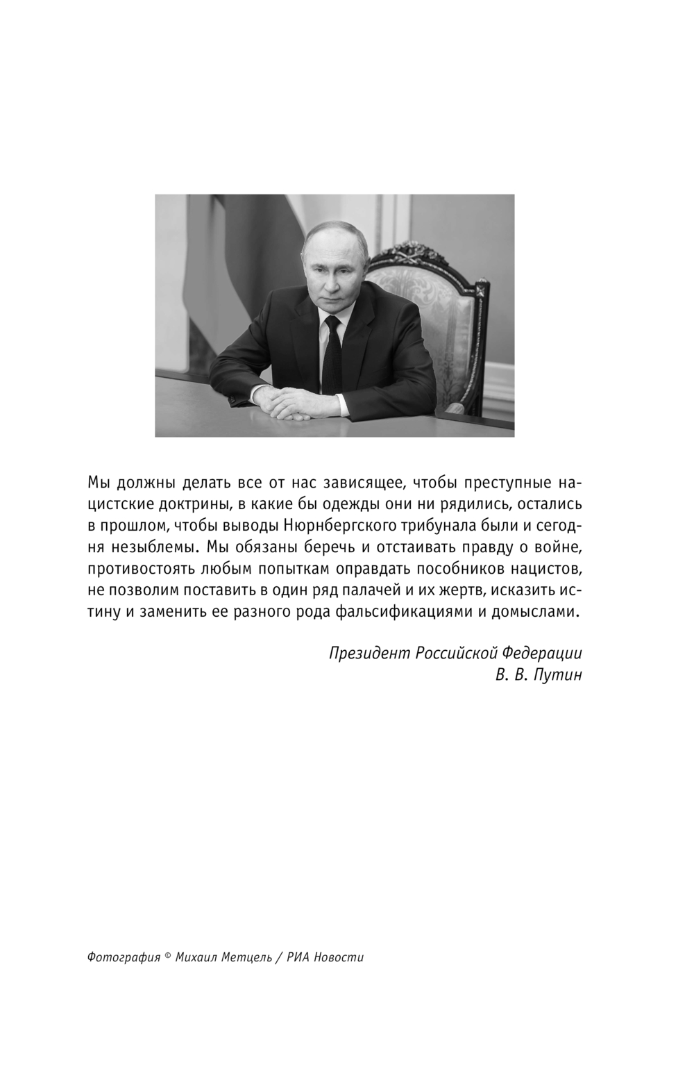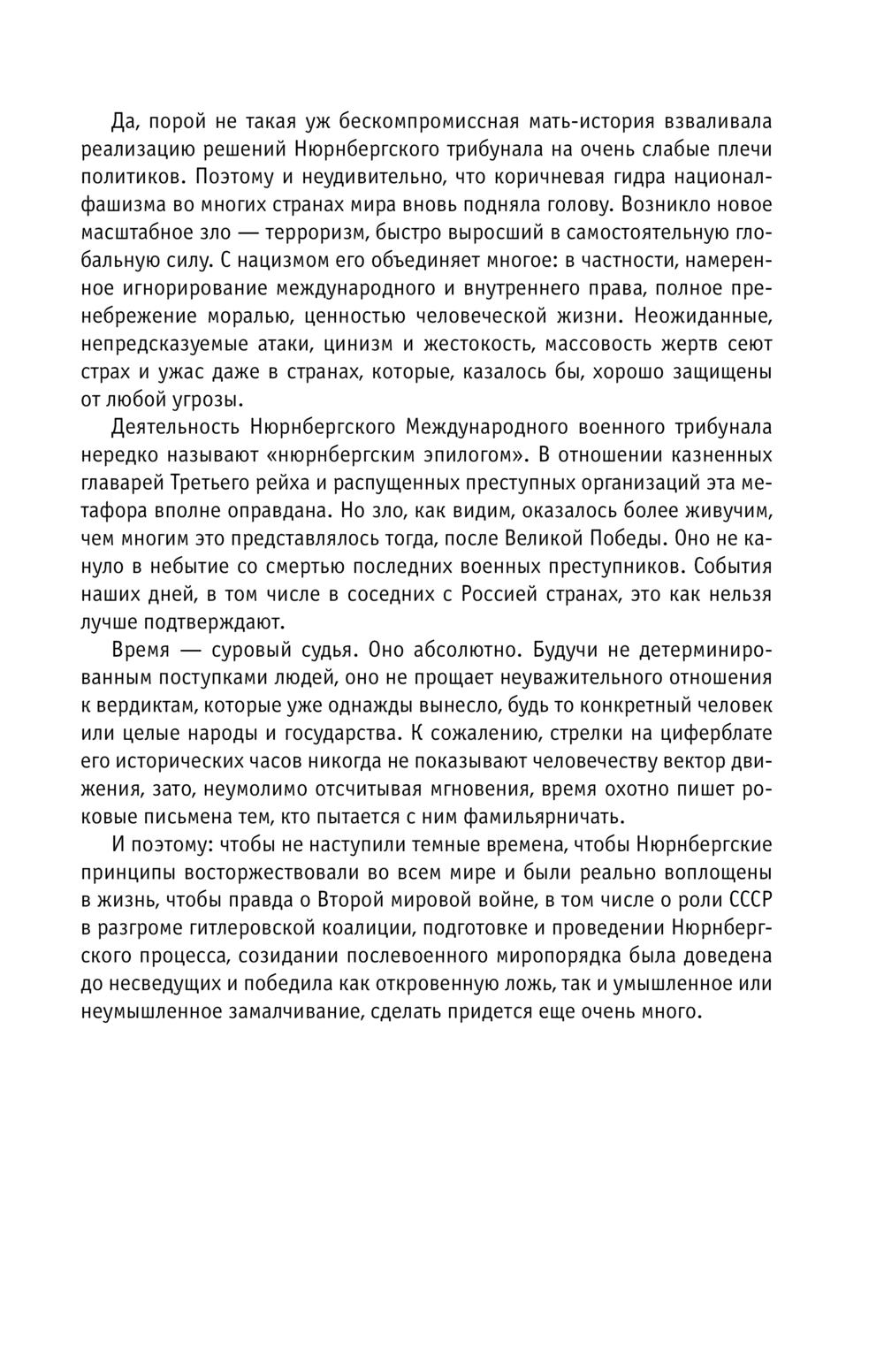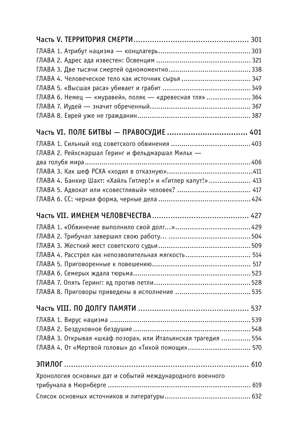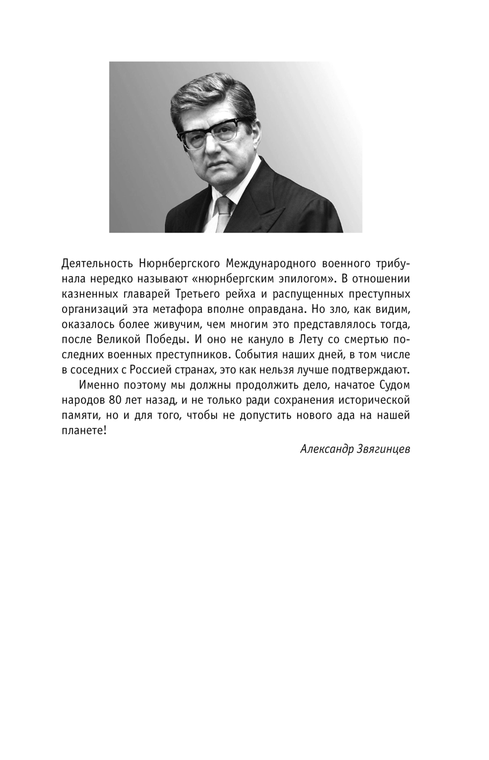 Книга посвящена самому важному судебному процессу в истории человечества – Нюрнбергскому трибуналу. Международный военный трибунал в Нюрнберге стал первым в истории опытом осуждения преступлений государственного масштаба – правящего режима, его карательных институтов, высших политических и военных деятелей, промышленников и финансистов. Издание подготовлено на основе редких архивных документов, в том числе недавно рассекреченных, малодоступных источников, новейших исследований, воспоминаний современников, а также личных встреч автора с непосредственными участниками тех далеких событий и их родственниками. Часть материалов публикуется впервые.
