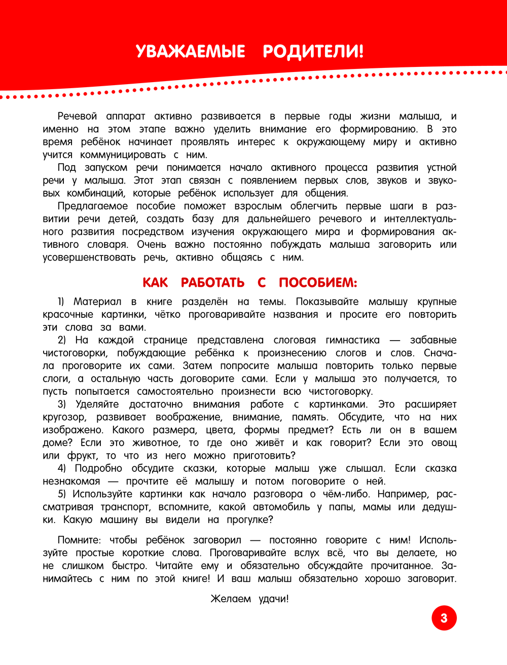 Главная задача пособия – помочь ребёнку заговорить или улучшить его речь. Великолепные цветные картинки по основным темам, необходимым для гармоничного развития малыша, чистоговорки на развитие речевых навыков и речевого слуха помогут сделать процесс обучения интересным и занимательным, а также призваны побудить ребёнка повторять за взрослым и говорить слова и фразы.
