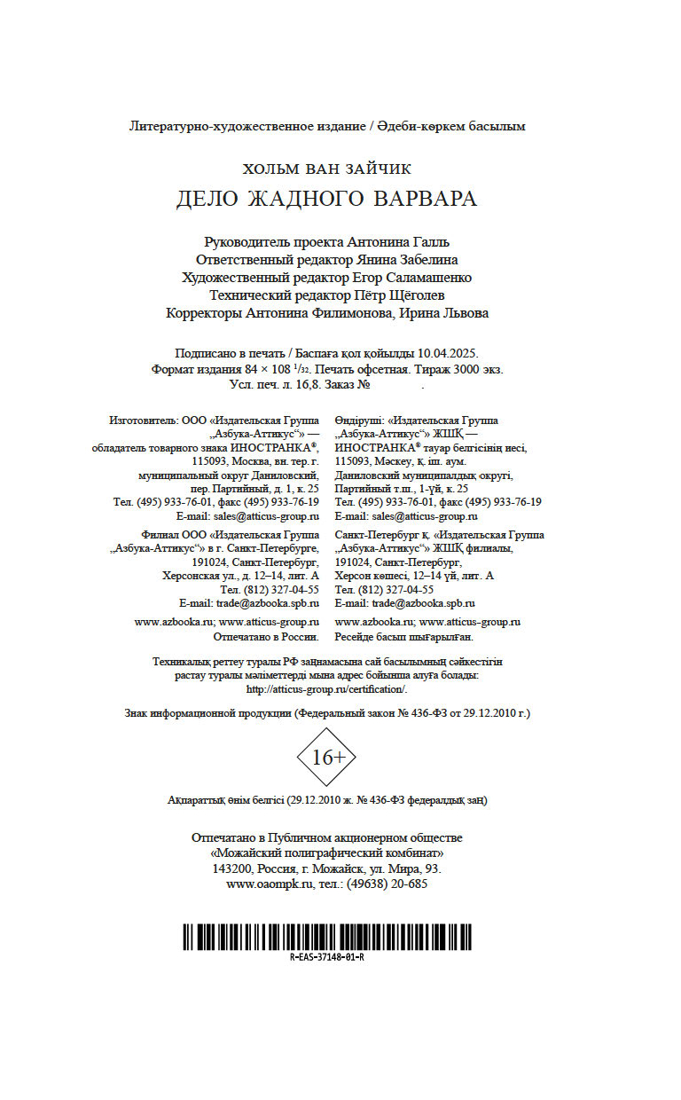 | Изготовитель | ООО "Издательство "Иностранка". 109017, РФ, г. Москва, ул. Пятницкая, 41 |