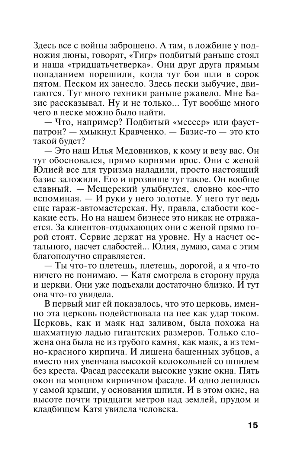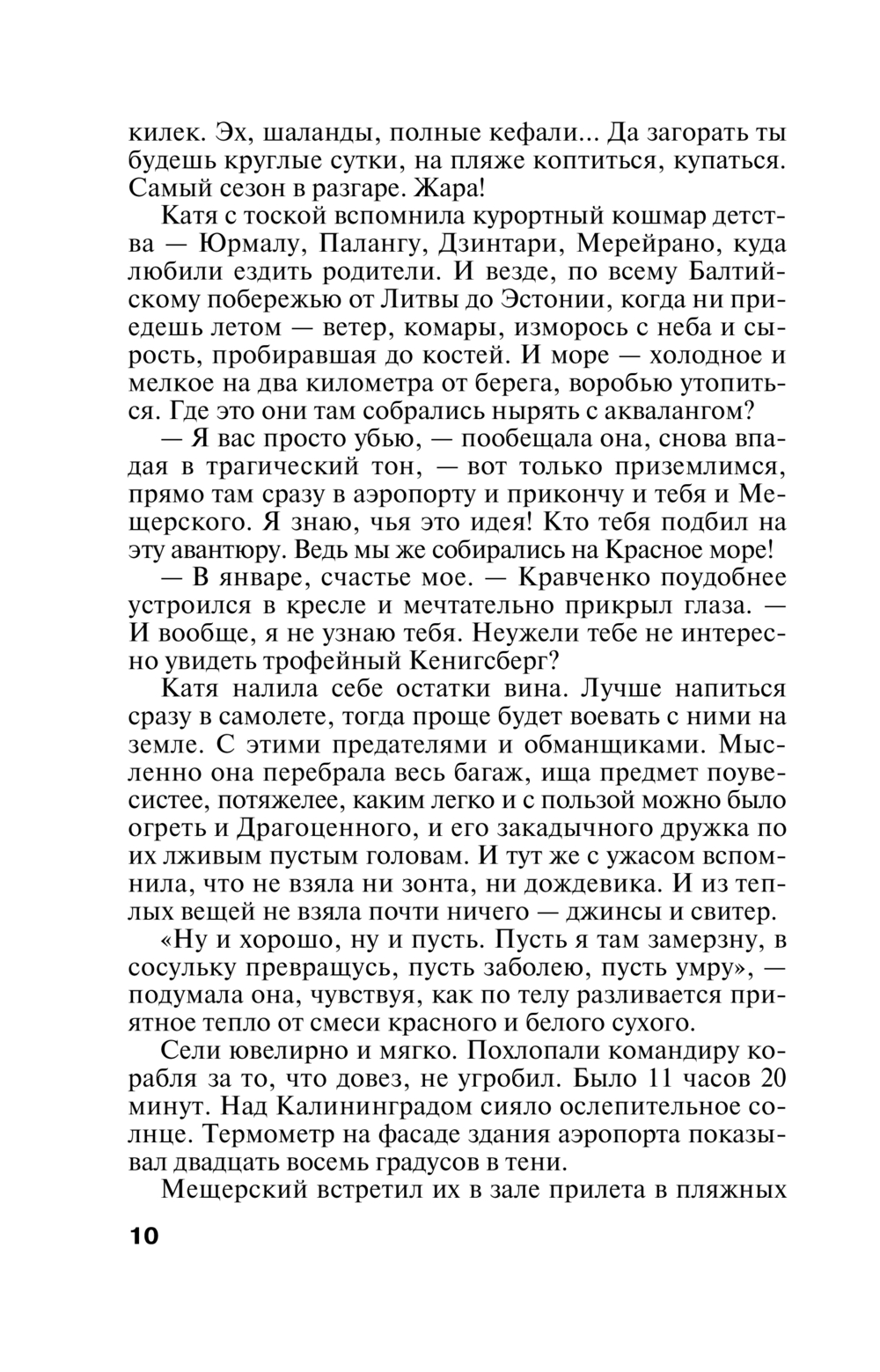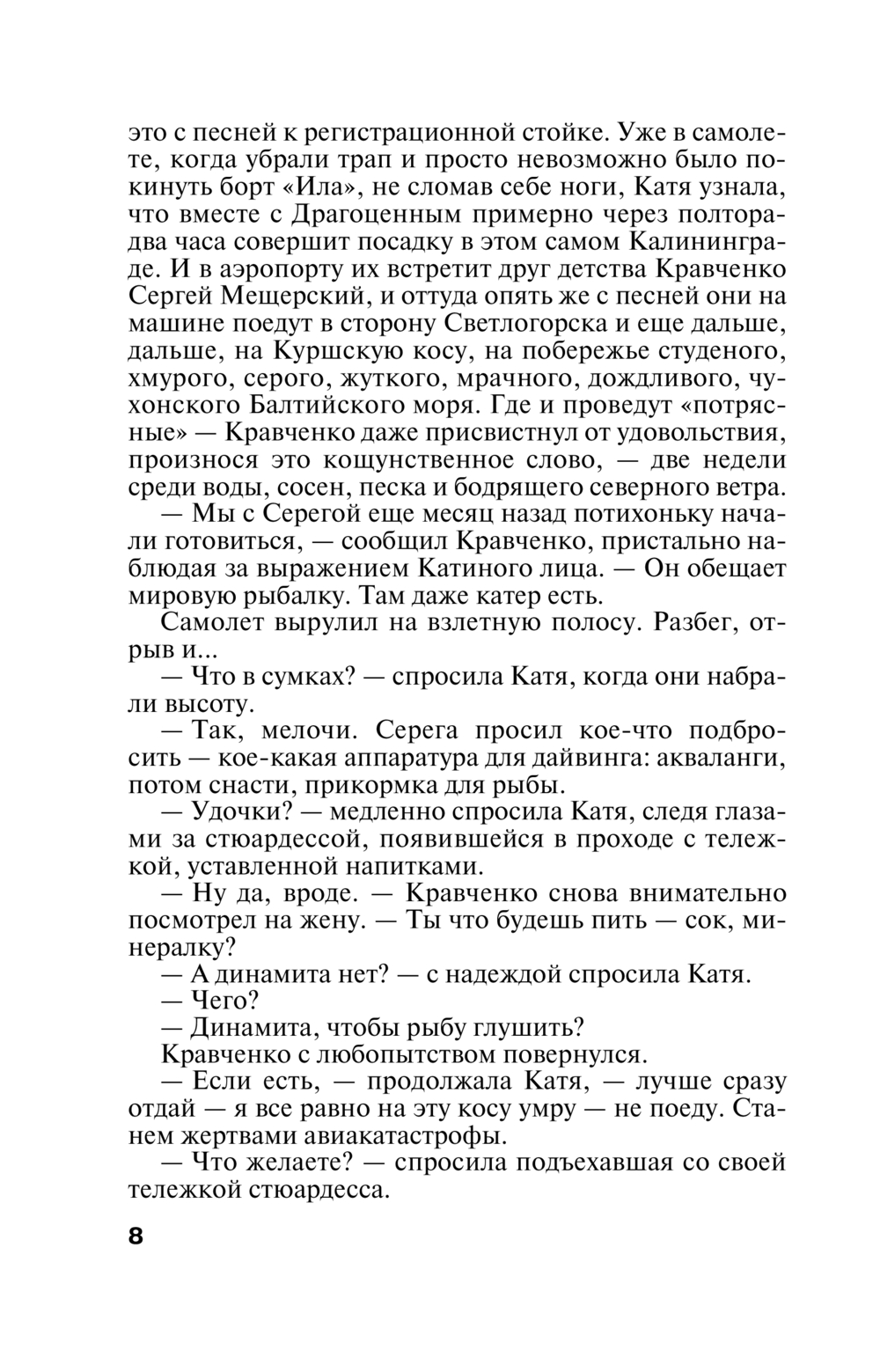 Странный отпуск получился у сотрудницы Пресс-центра УВД Кати Петровской. Вместе с мужем Вадимом Кравченко и их другом Сергеем Мещерским они приехали на прибалтийский курорт и в первый же день стали свидетелями свирепого и загадочного убийства. Этим дело не ограничилось – через несколько дней нашли мертвой девочку-подростка. Как выяснила Катя, такие "происшествия" с юными девушками здесь не в новинку. Но убийца, словно призрак, не оставляет никаких улик. А тут еще местные легенды о Водяном, мстящем людям, его мокрые следы регулярно обнаруживают на полу церкви. Сразу трое – Катя, Мещерский и местная жительница Марта – вычислили убийцу. Только Мещерский в момент озарения был на рыбалке в море, а Катя и Марта оказались лицом к лицу с обезумевшим маньяком...
