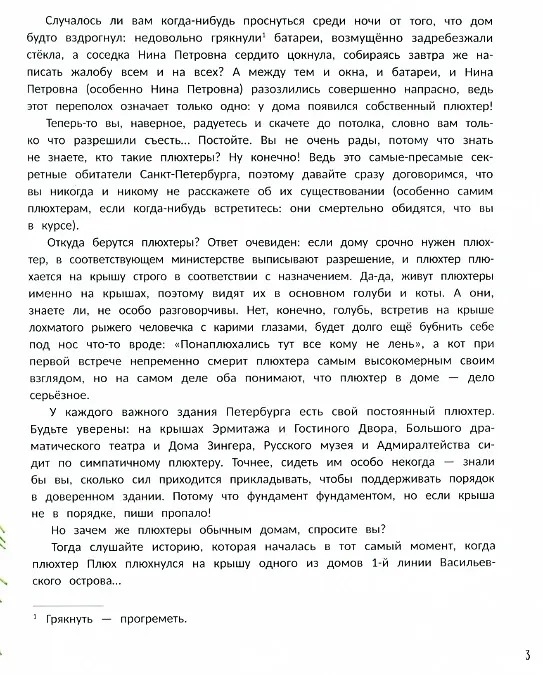 На крышах самых известных зданий Петербурга обитают плюхтеры – человечки, которые присматривают за порядком. Иногда плюхтеров отправляют и на крыши обычных домов. Плюхтер Плюх попал на крышу одного из домов 1-й линии Васильевского острова. С помощью голубя Екатерины Второй и кота Пирожка он должен разрешить накопившиеся в доме проблемы, а главное – помирить обитателей коммунальной квартиры номер семь, в которой началась настоящая война, и выяснить, кто и зачем крадёт вывешенное сушиться на чердаке бельё. Плюхтер применяет разные уловки, чтобы помочь жильцам объединиться накануне Нового года.