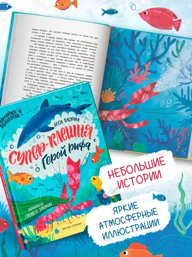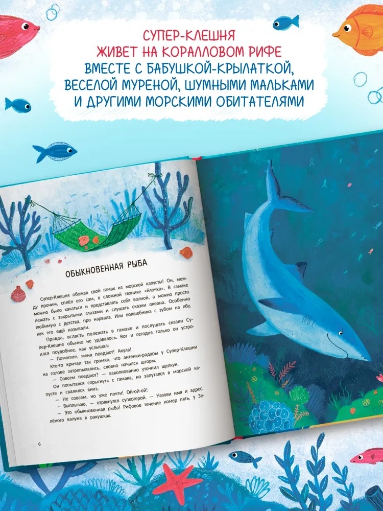 А что, если под водой тоже есть супергерои? Супер-Клешня живёт на коралловом рифе вместе с бабушкой-крылаткой, весёлой муреной, шумными мальками и другими морскими обитателями. Одна клешня у него обычного размера, а другая – огромная! Он щёлкает ею и поднимает тонну пузырьков. Тому, кто попадёт под мощный удар, мало не покажется!