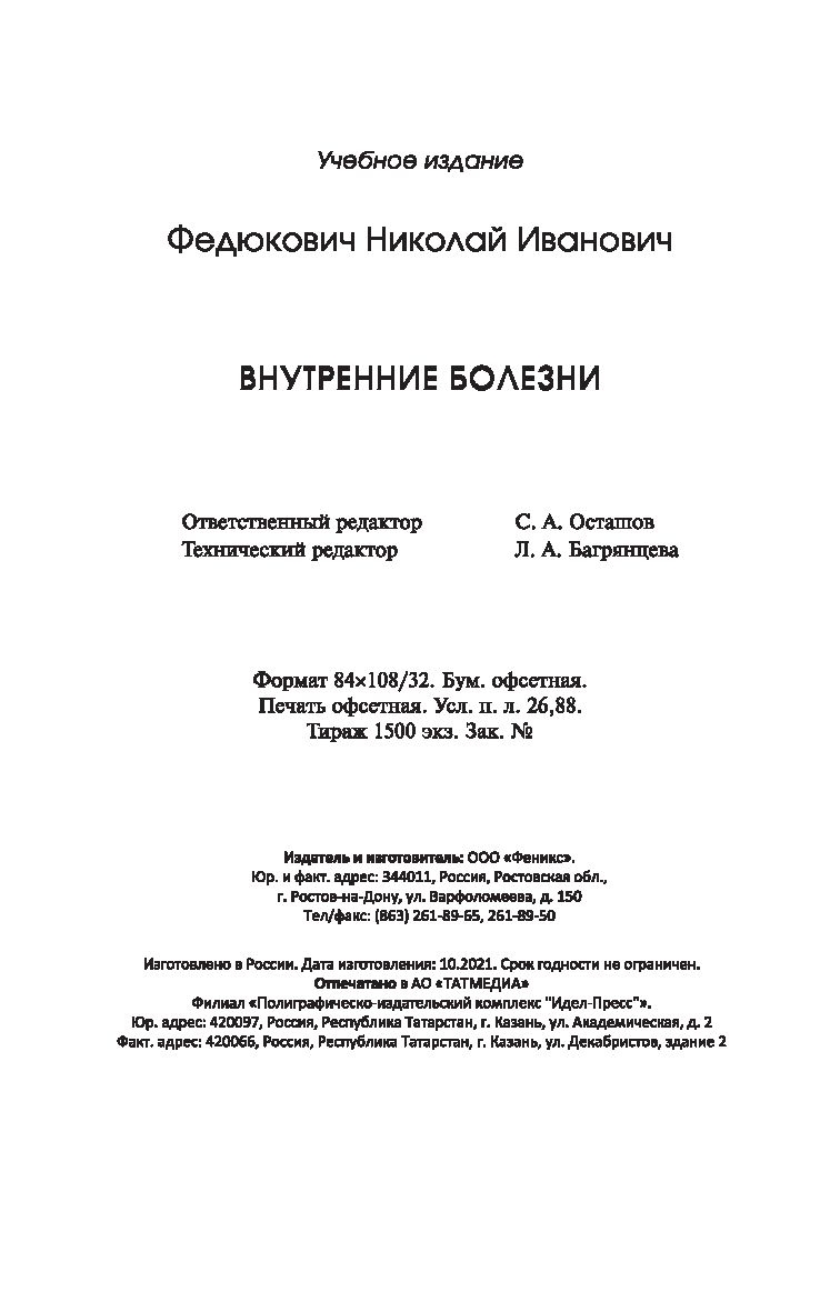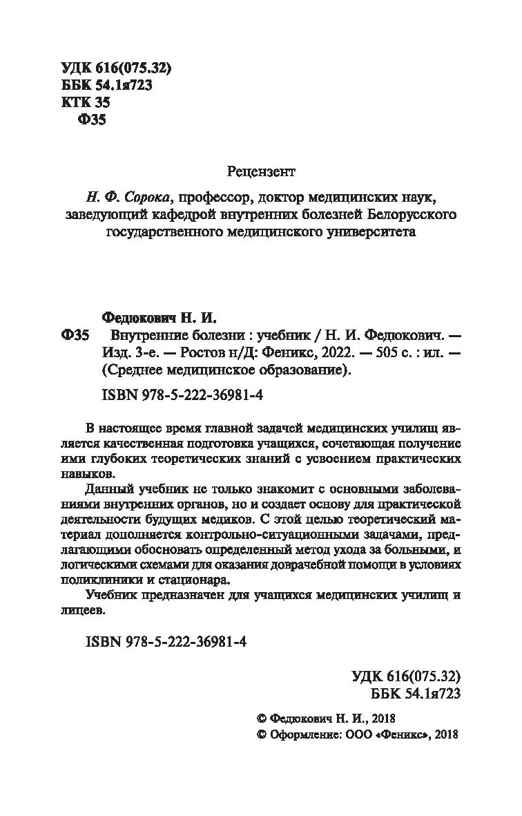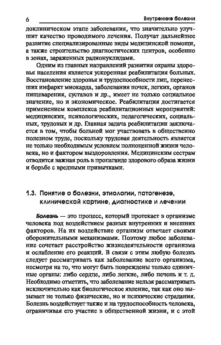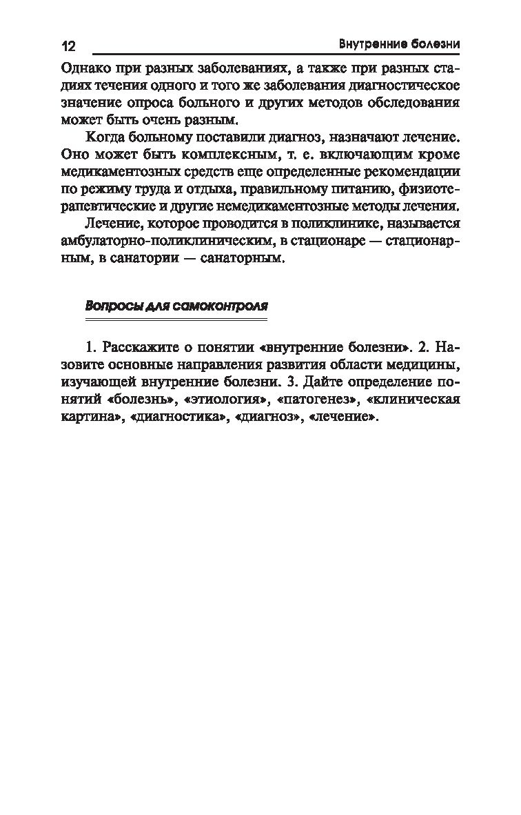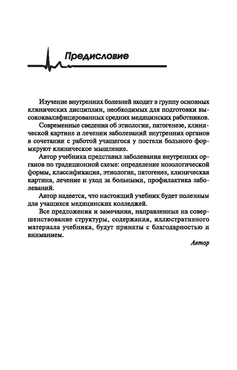 Данный учебник не только знакомит с основными заболеваниями внутренних органов, но и создает основу для практической деятельности будущих медиков. С этой целью теоретический материал дополняется контрольно-ситуационными задачами, предлагающими обосновать определенный метод ухода за больными, и логическими схемами для оказания доврачебной помощи в условиях поликлиники и стационара.
